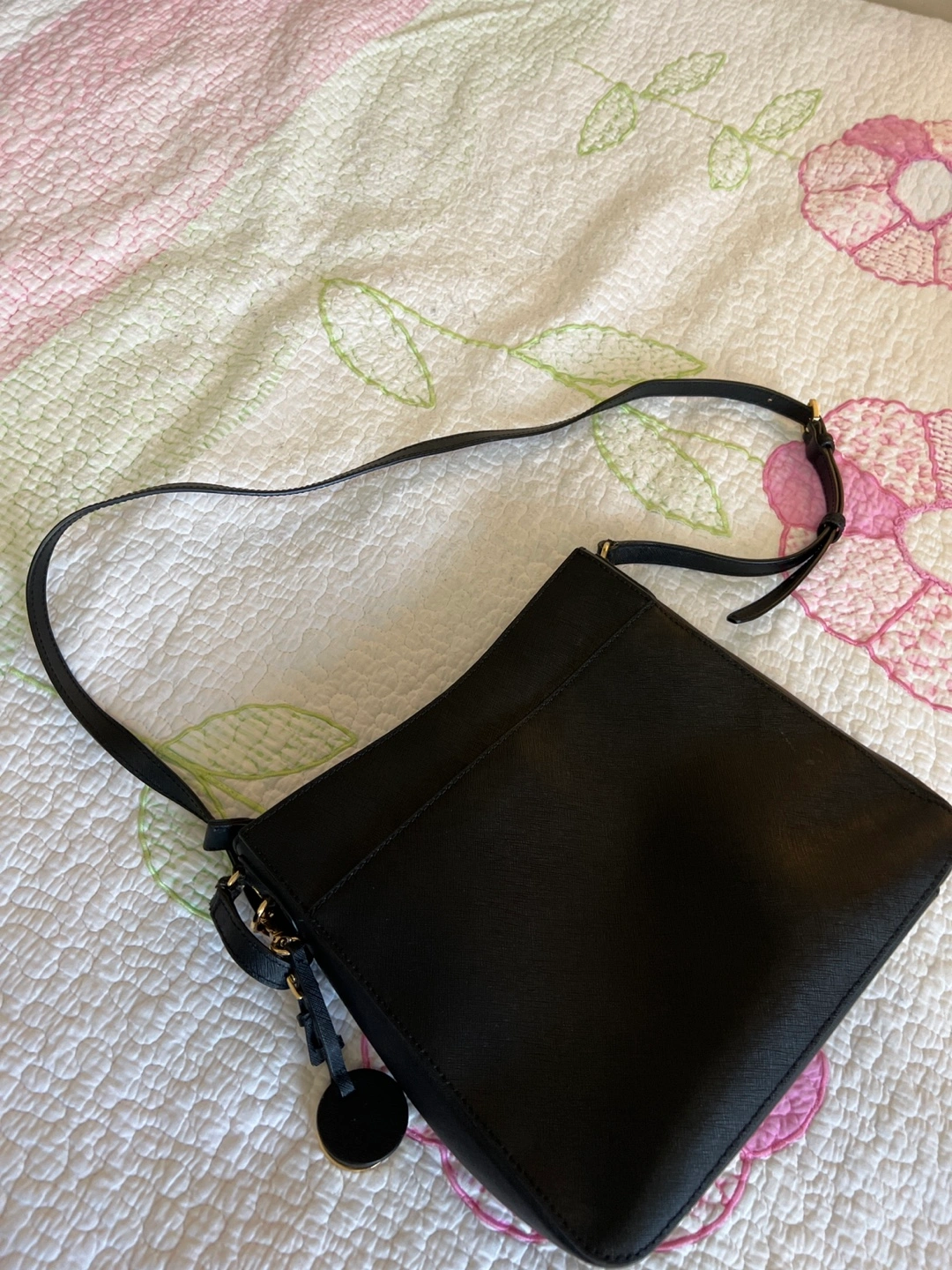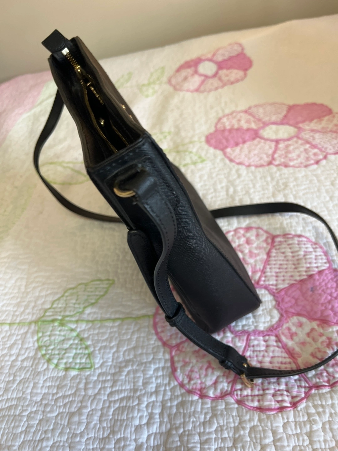 Black crossbody bag. Adjustable strap. Small zippered pocket. Gold hardware. Excellent pre-owned condition.
