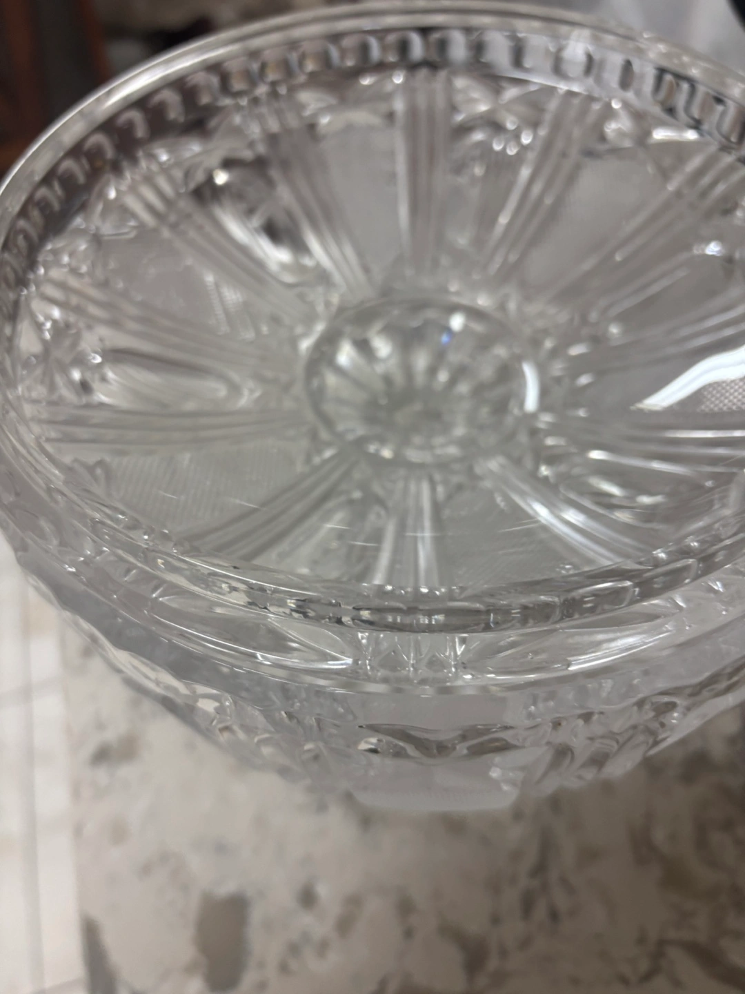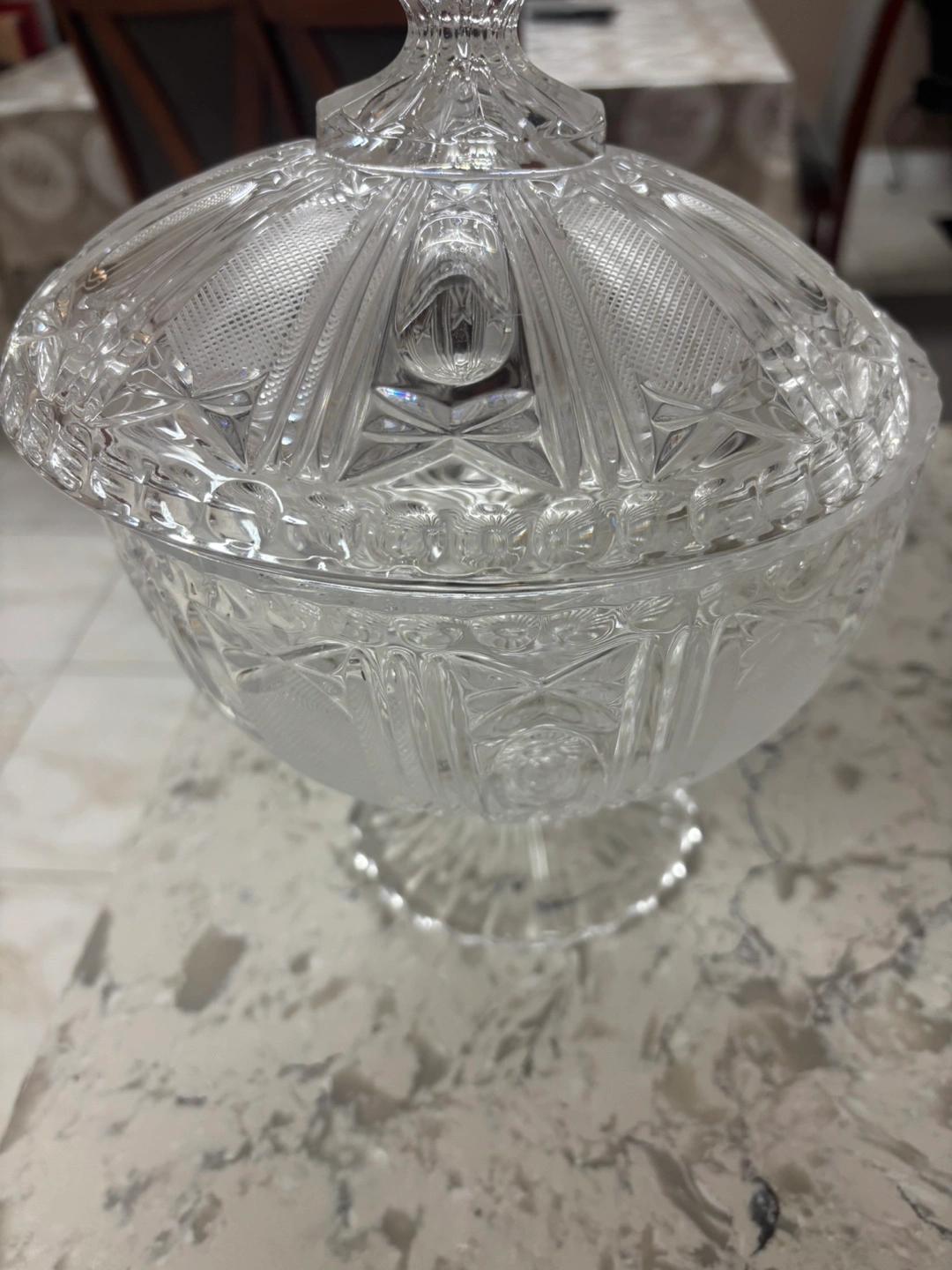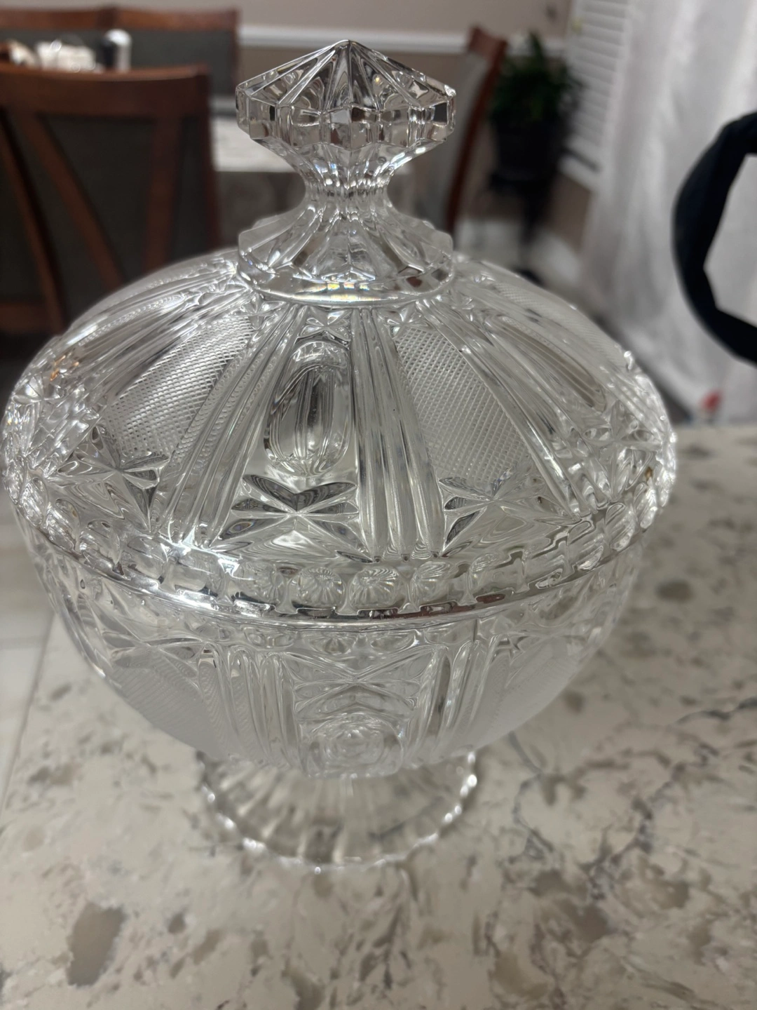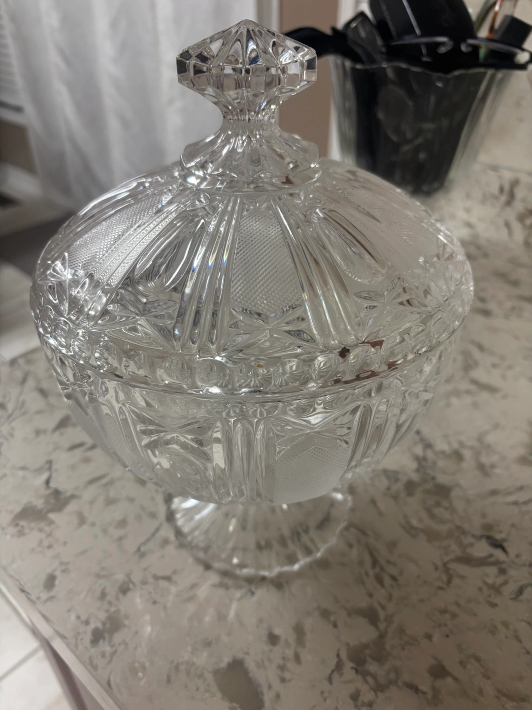 Beautiful crystal candy dish. Intricate cut glass design. Pedestal base. Matching lid. Perfect for displaying candy or other treats.