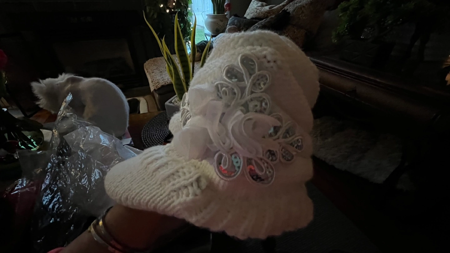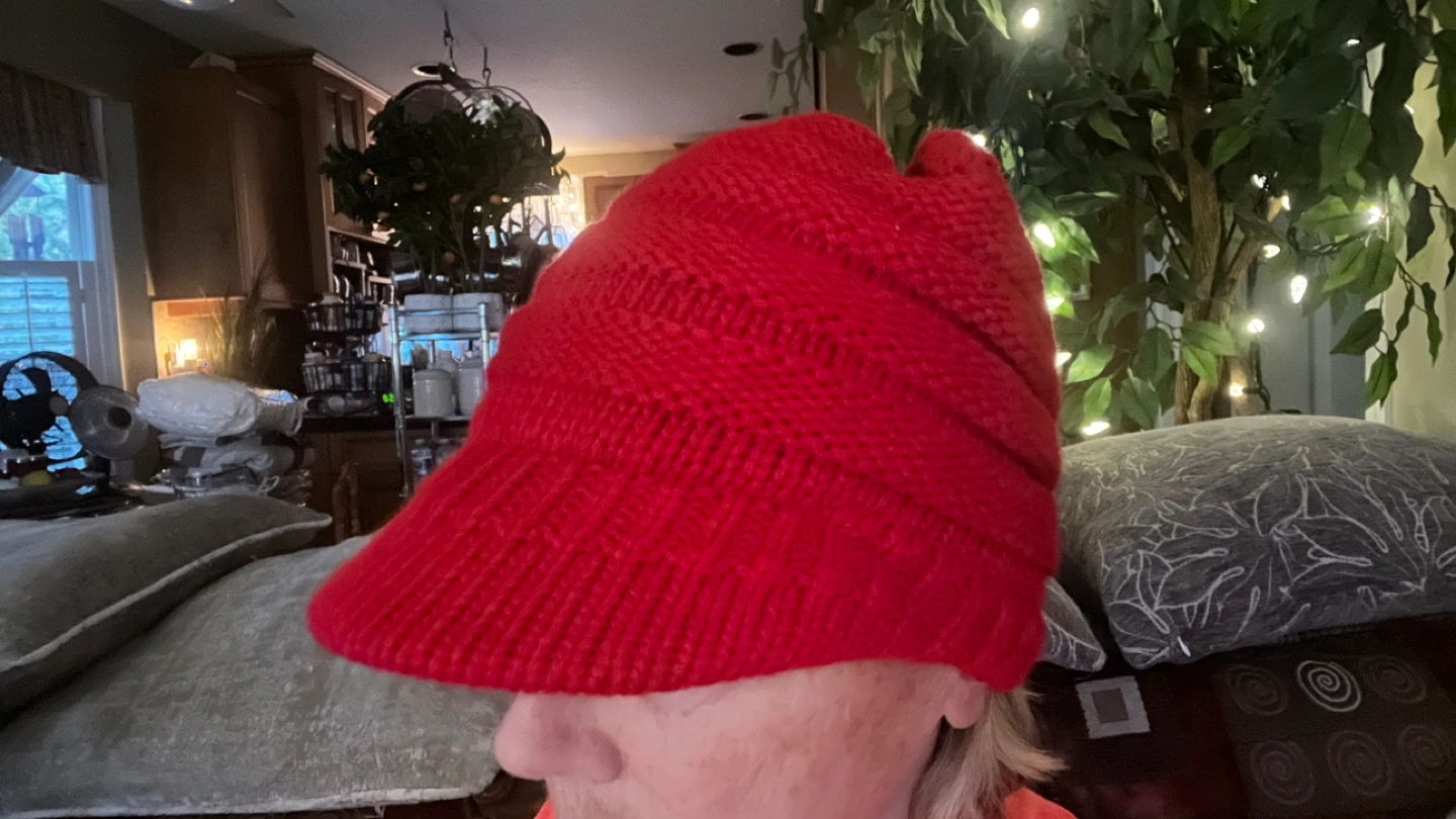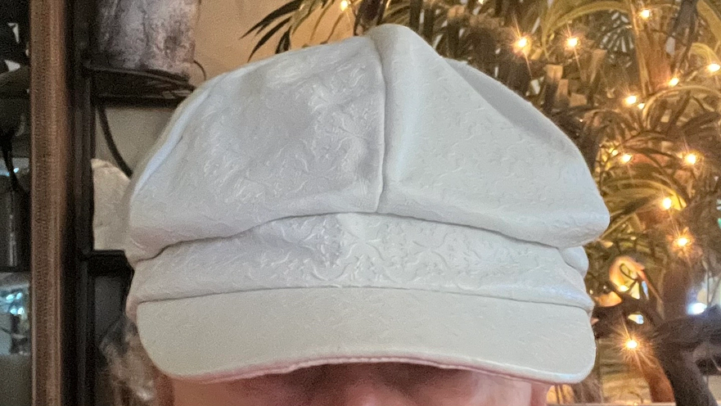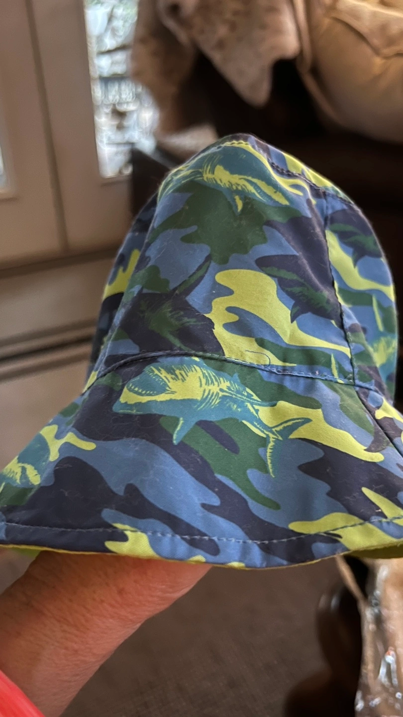 Women’s hats. One lime green bucket hat, one shark camo bucket hat, one red knit beanie with sequins, one winter white leather hat. Sizes vary.