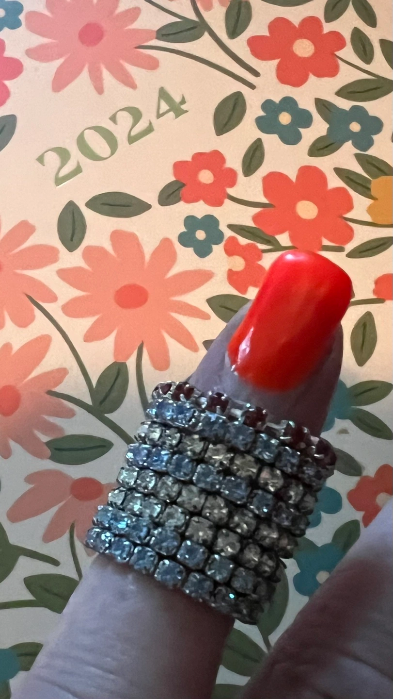 Seven stackable toe rings. Clear rhinestone and red gemstone accents. Silver-toned metal. Perfect for layering.