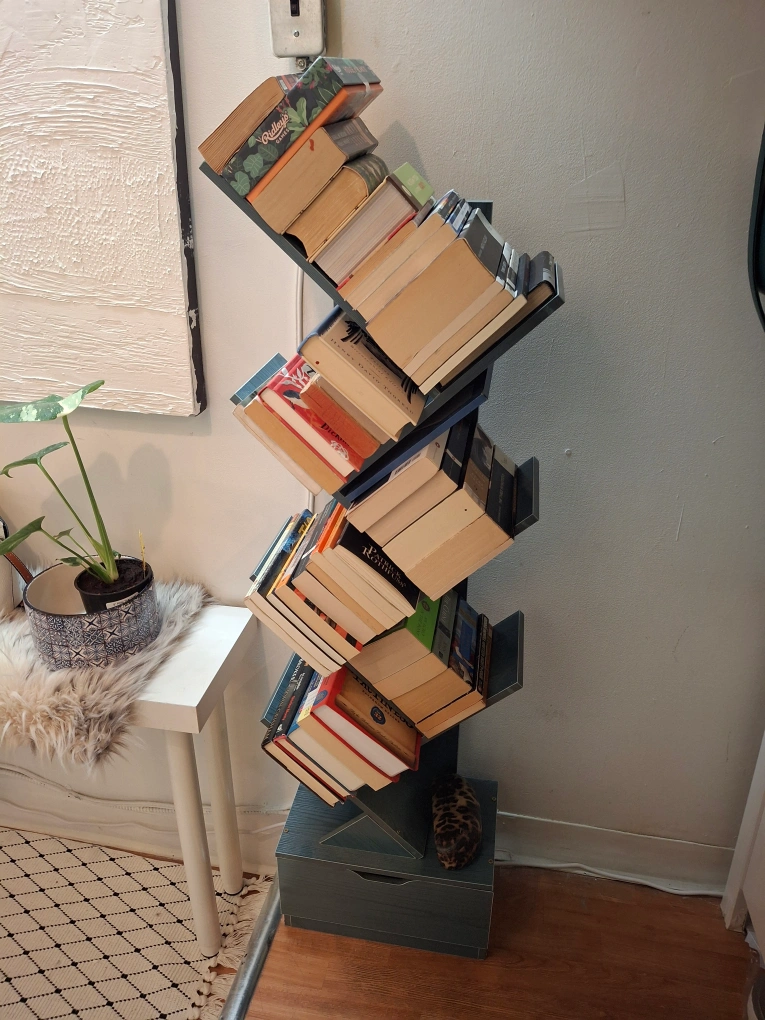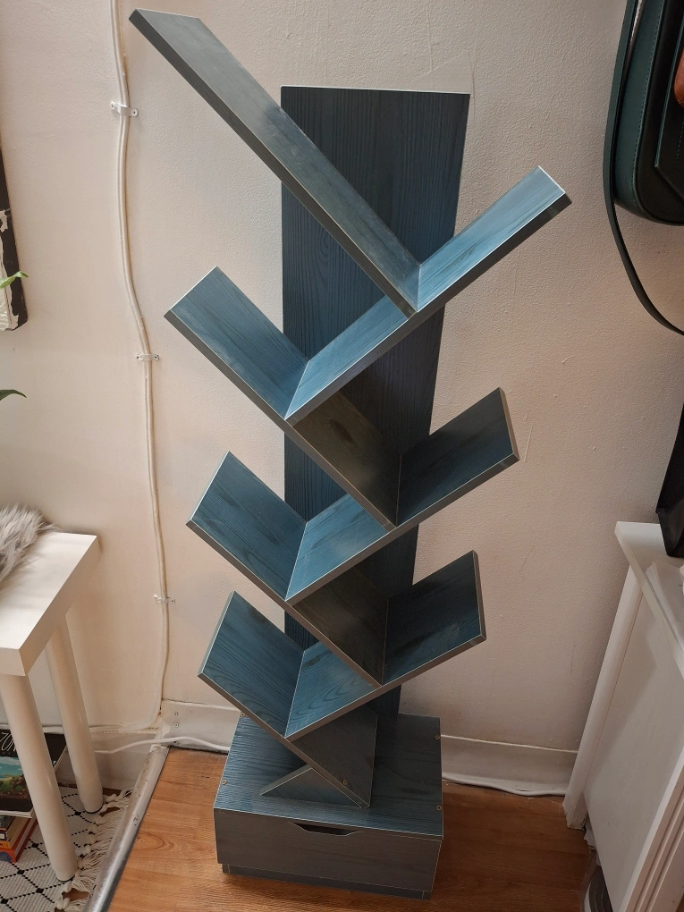 Unique teal coloured book stand. Holds many books in the 7 tiers and there is a drawer in the bottom. Modern design. Great for home decor. Original price was $120.