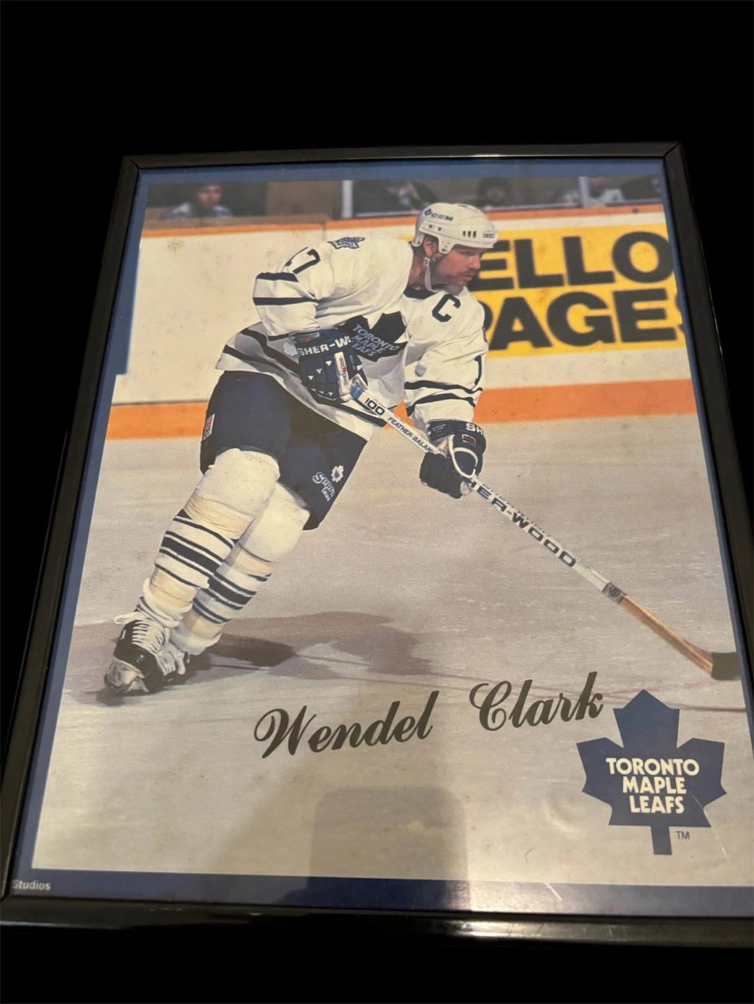 Framed photo of Wendel Clark playing for the Toronto Maple Leafs. Includes player name and team logo. Black frame.