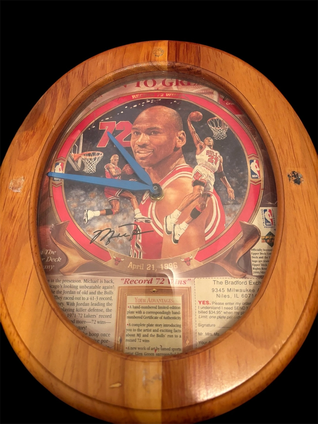 Collectible wall clock. Features Michael Jordan image. Wooden frame. Limited edition. Hand-numbered. Certificate of authenticity included. Bradford Exchange.