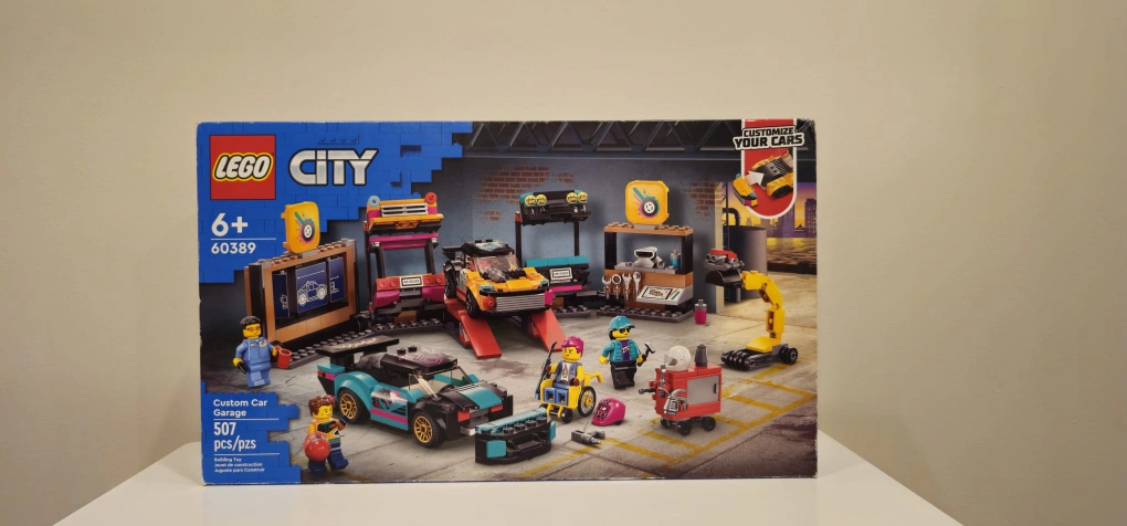 New sealed LEGO City set. Number 60389. Custom Car Garage. 507 pieces. Ages 6+. Includes minifigures and vehicles.