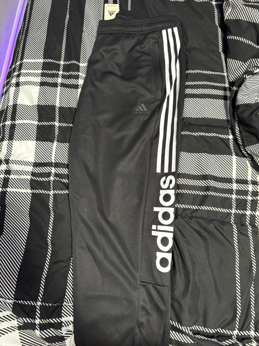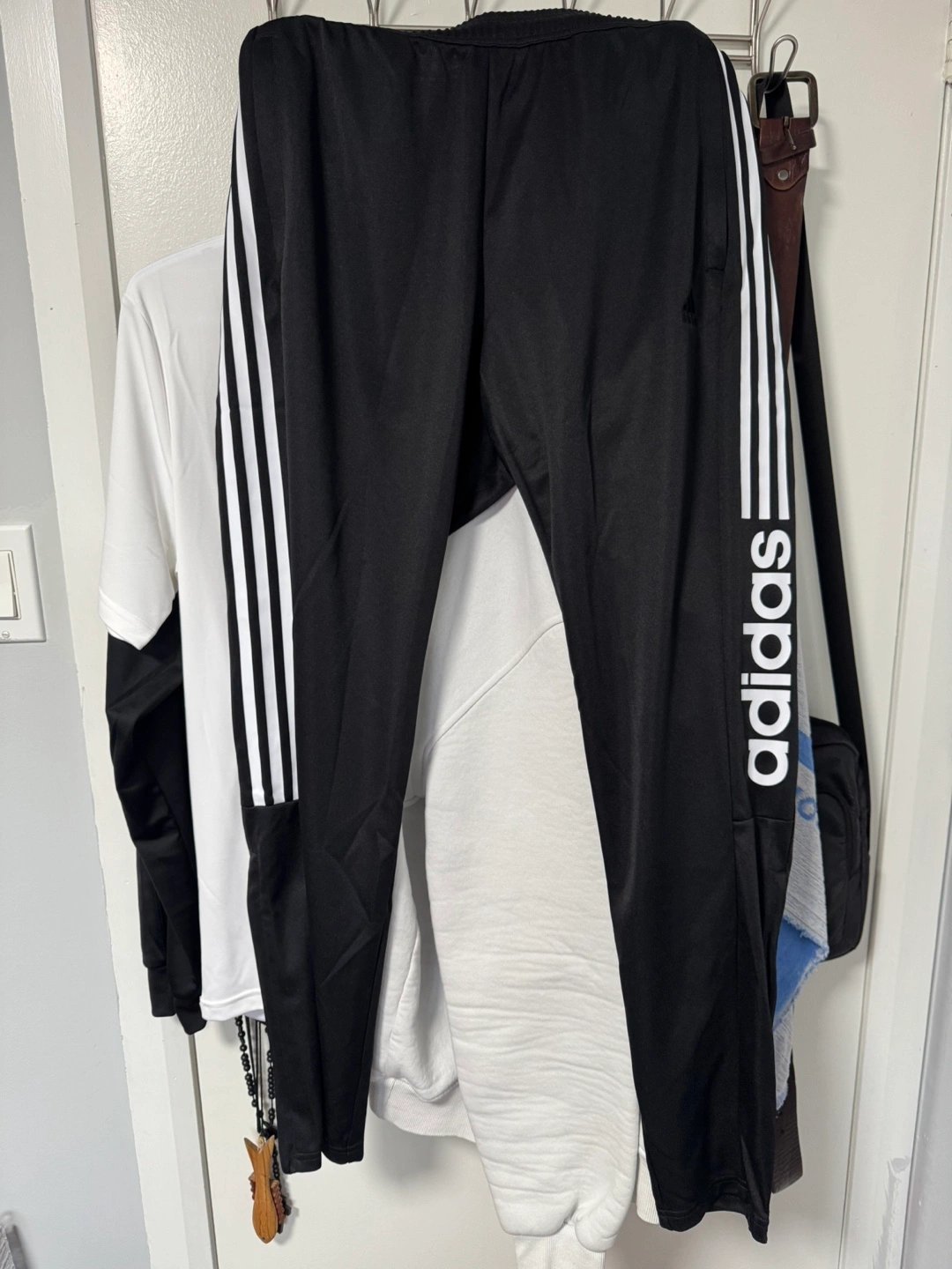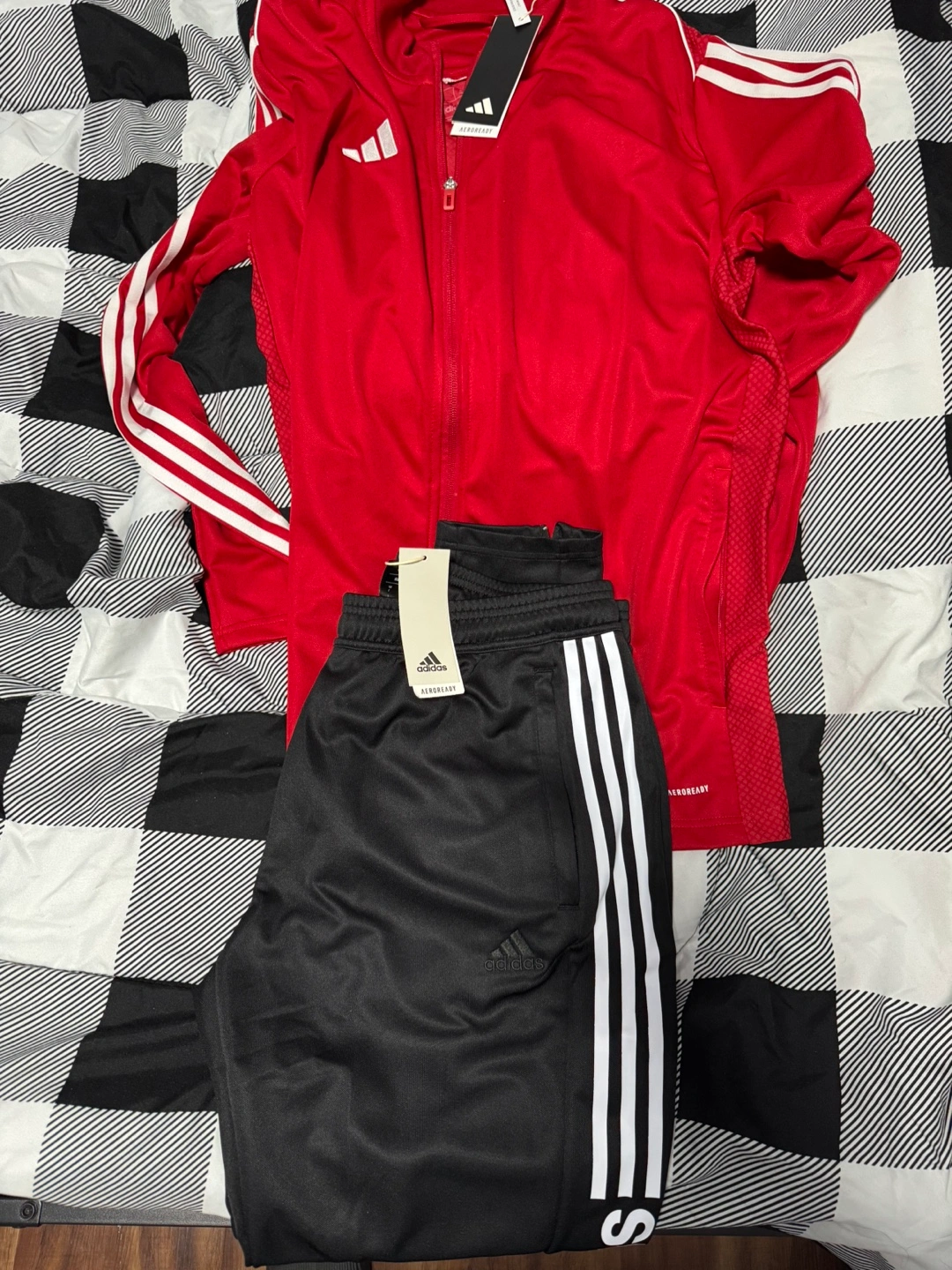 Men's Adidas tracksuit. Red jacket, black pants. Aeroready technology. Three white stripes down the side of the pants.