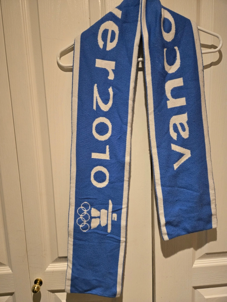 Official Vancouver 2010 Olympic Winter Games scarf. Blue with white accents. Features the Olympic rings and Vancouver 2010 logo.