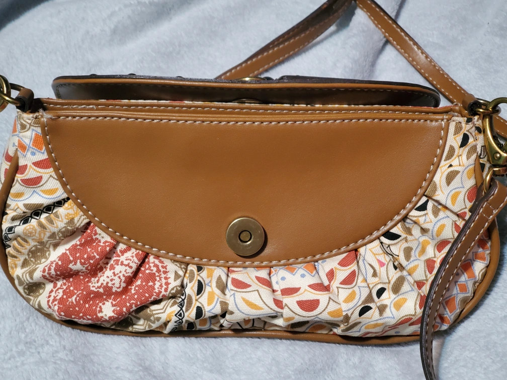 Adorable crossbody bag. Features a woven straw flap, brown leather trim, and colourful patterned fabric. Adjustable strap. Small size, perfect for essentials.