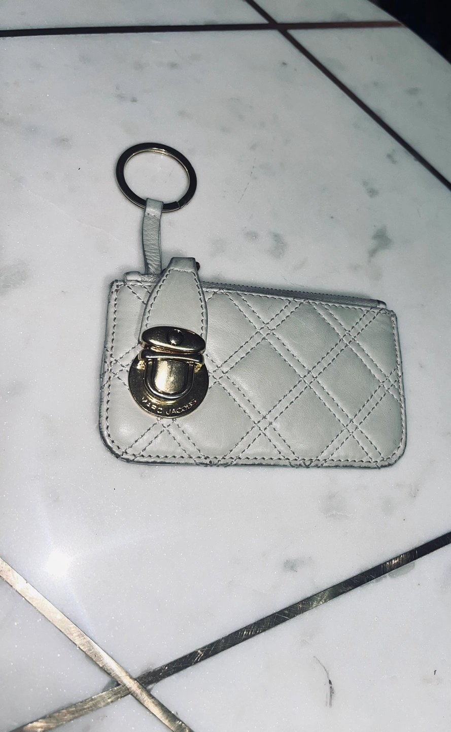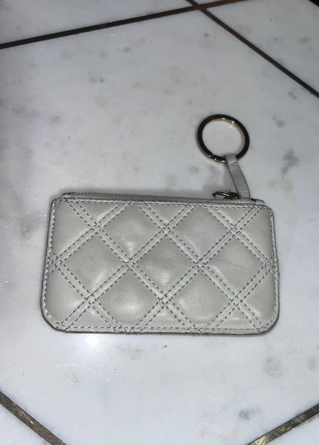 Off-white quilted leather keychain wallet. Features a gold-toned zipper and clasp. Compact design, perfect for cards and small essentials.