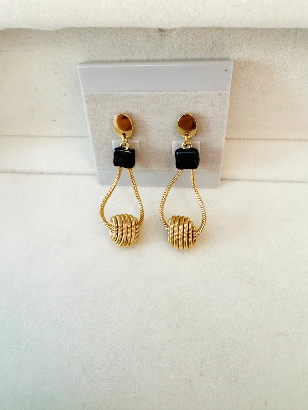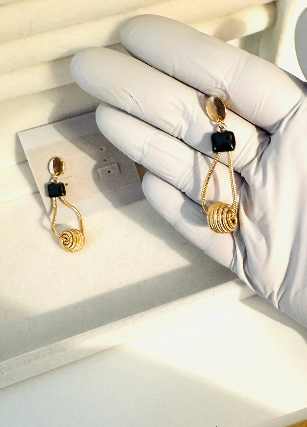 Elegant Dangling Earrings 14K Gold Plated, featuring hand enameling w Black Onyx all around.