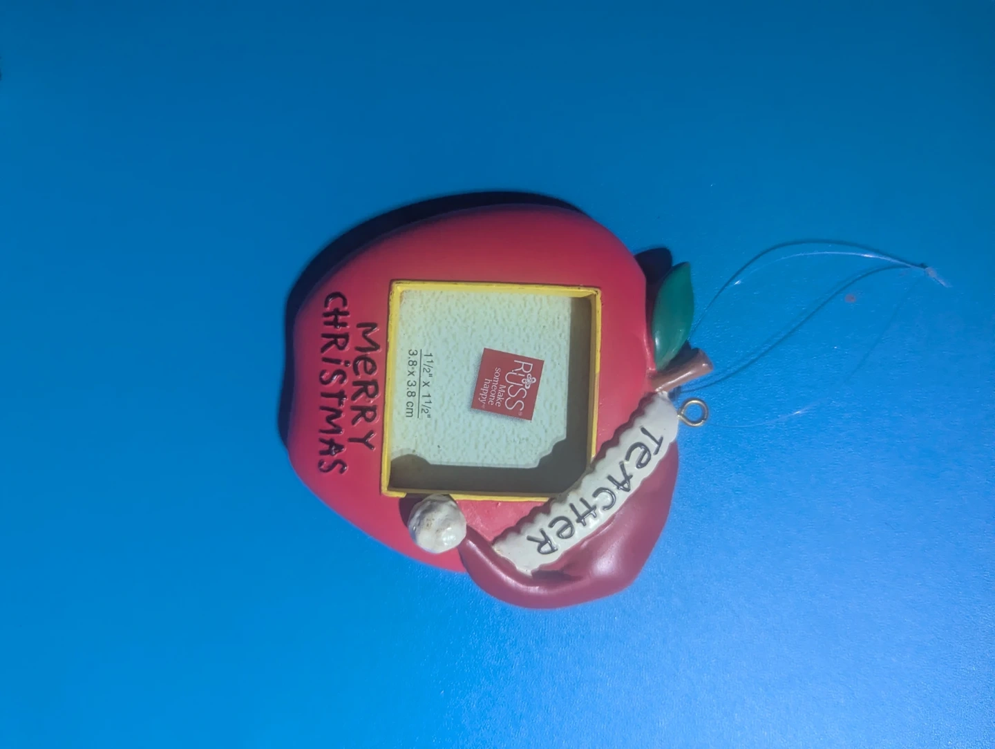 This Russ ornament is shaped like a red apple with a "Merry Christmas" message and a "Teacher" ribbon. It's designed to hold a 1 1/2" x 1 1/2" (3.8 x 3.8 cm) photo. A sweet way to commemorate a teacher this holiday season!