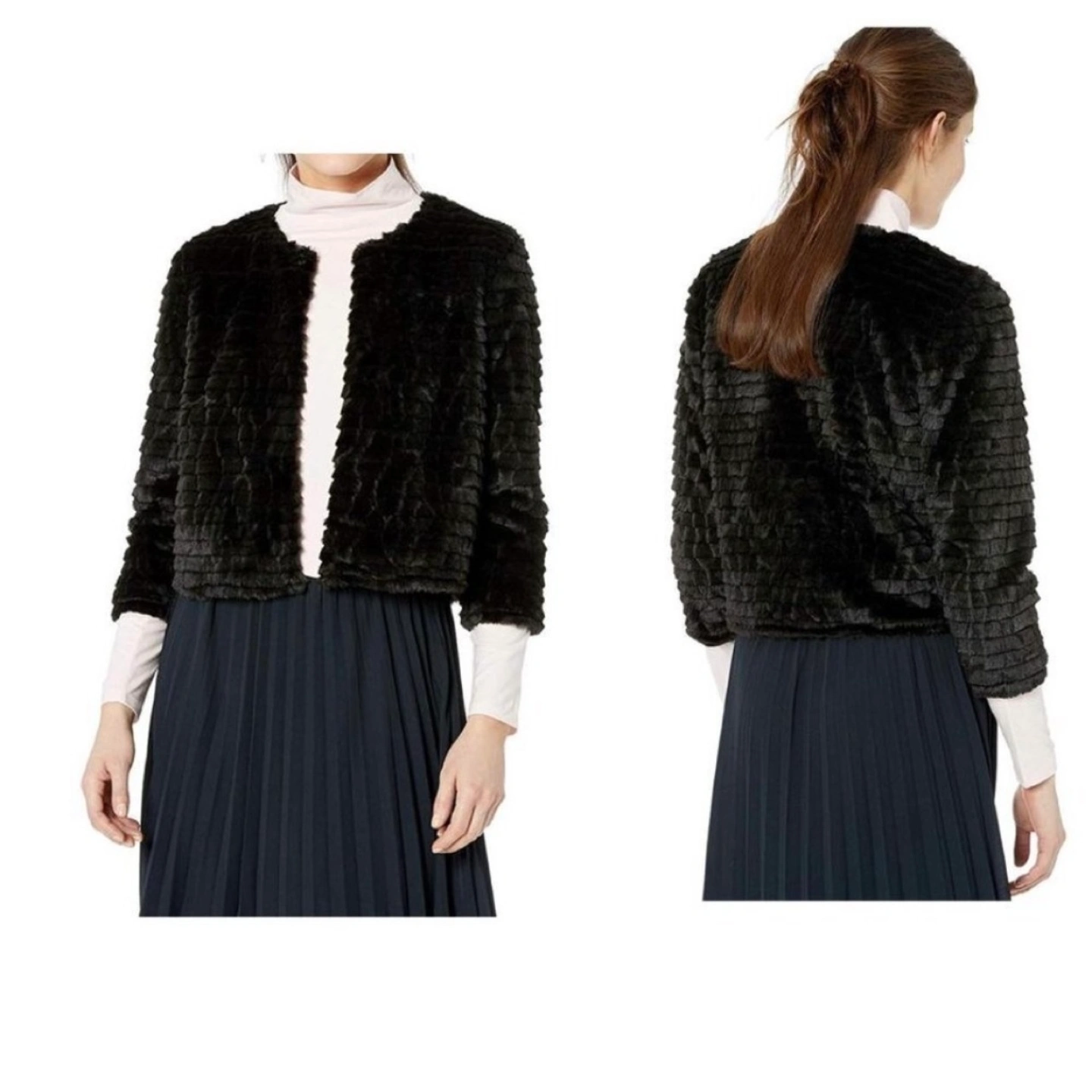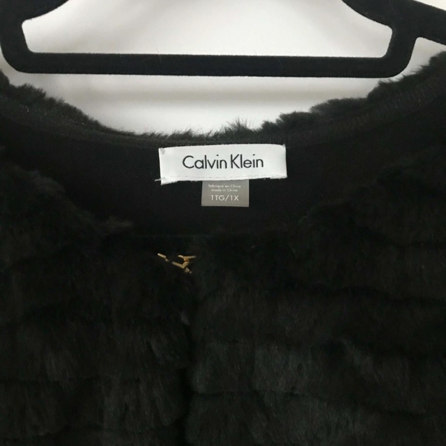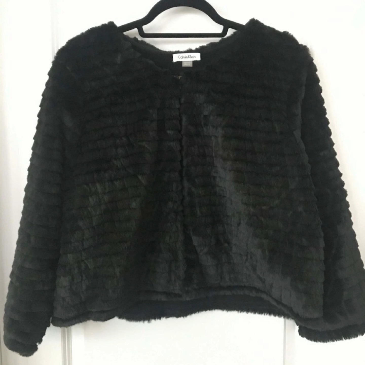 491Women's black faux fur jacket. Open front. Three-quarter sleeves. Soft and comfortable. Size 1X. Made in China. Beautifully textured, plush faux fur cropped shrug from Calvin Klein. Brand: Calvin Klein Style: Collarless; gold hook closure , Hits at waist; faux shearling look. Warm and sophisticated. 3/4-sleeves Shell: polyester; lining: acrylic Size 1X. Colour: Black PU queen and Gladstone Original price $89
