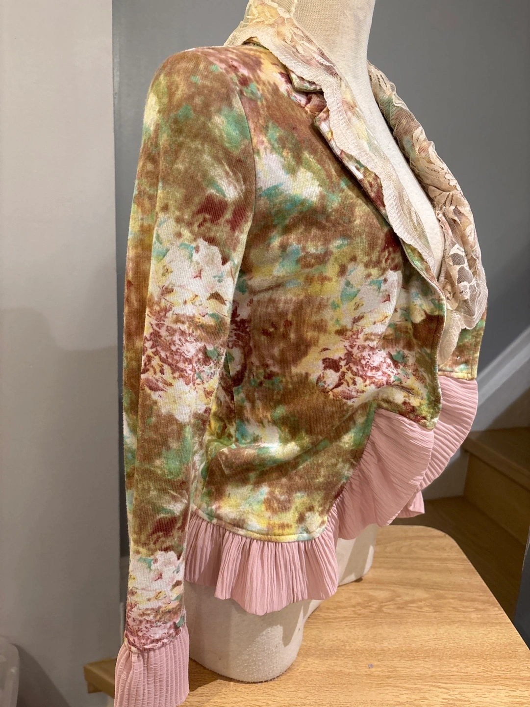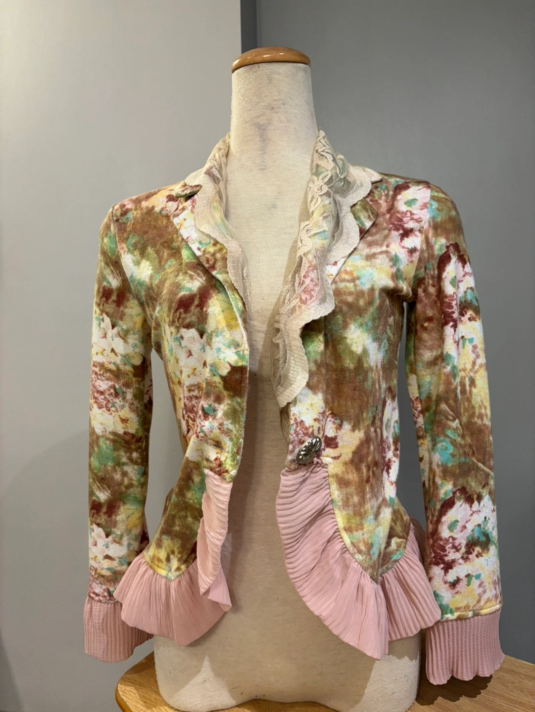 Women's jacket. Floral print. Long sleeves. Lace collar and ruffle detail. Pink ruffle trim. Button closure. Lightweight material.
