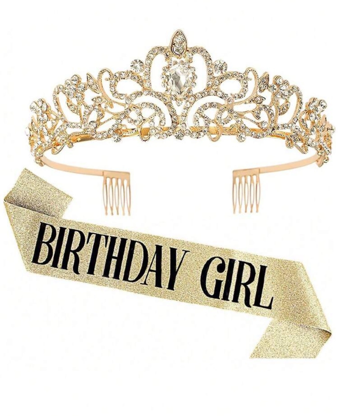 Gold sparkly birthday girl sash and rhinestone tiara. Perfect for a birthday celebration.