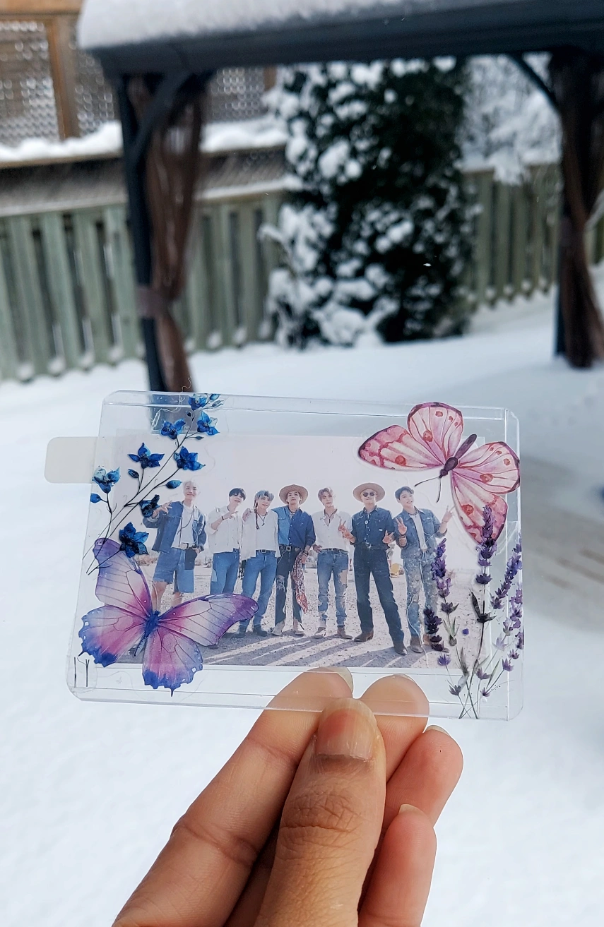 Clear resin photo frame. Features a picture of BTS, pressed flowers, and butterflies. Perfect for any ARMY!