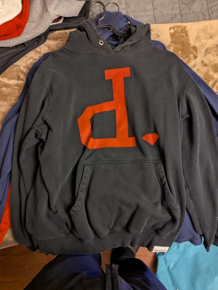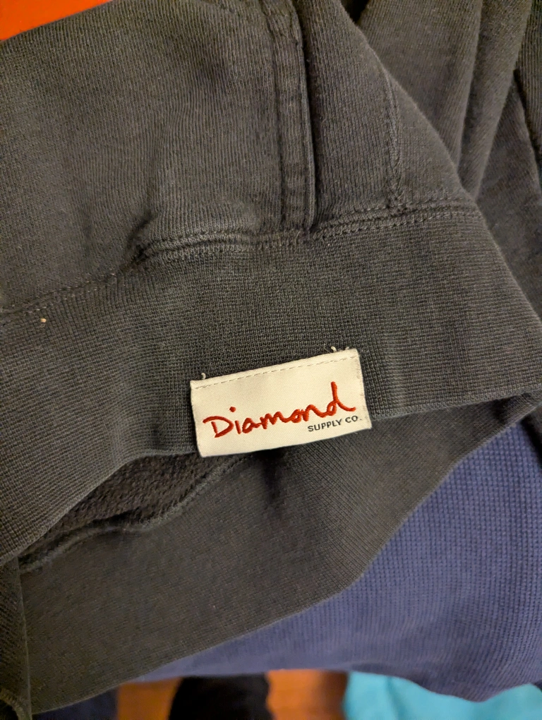 147Men's dark grey Diamond Supply Co. hoodie. Features a large red embroidered logo on the front. Good condition, some minor wear.
