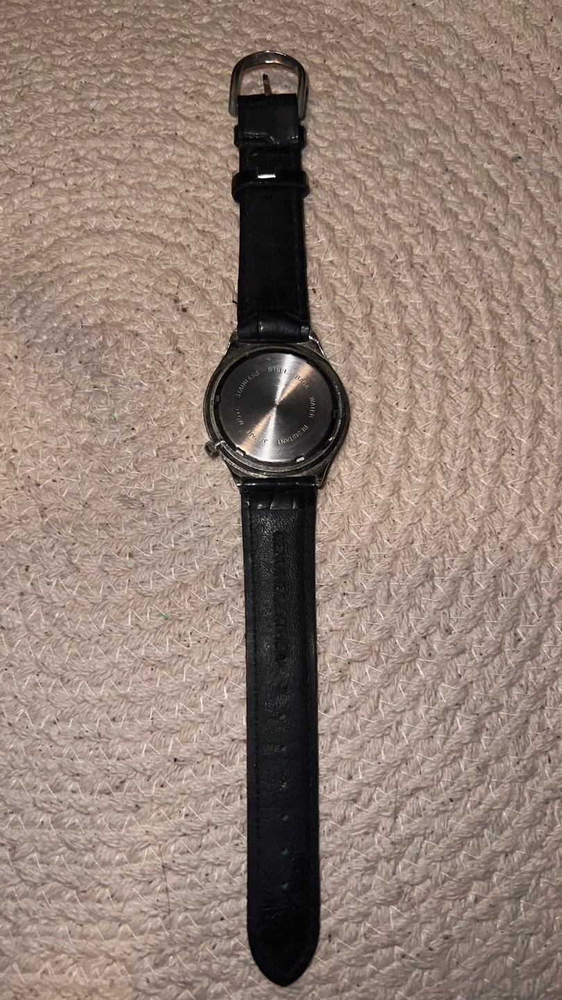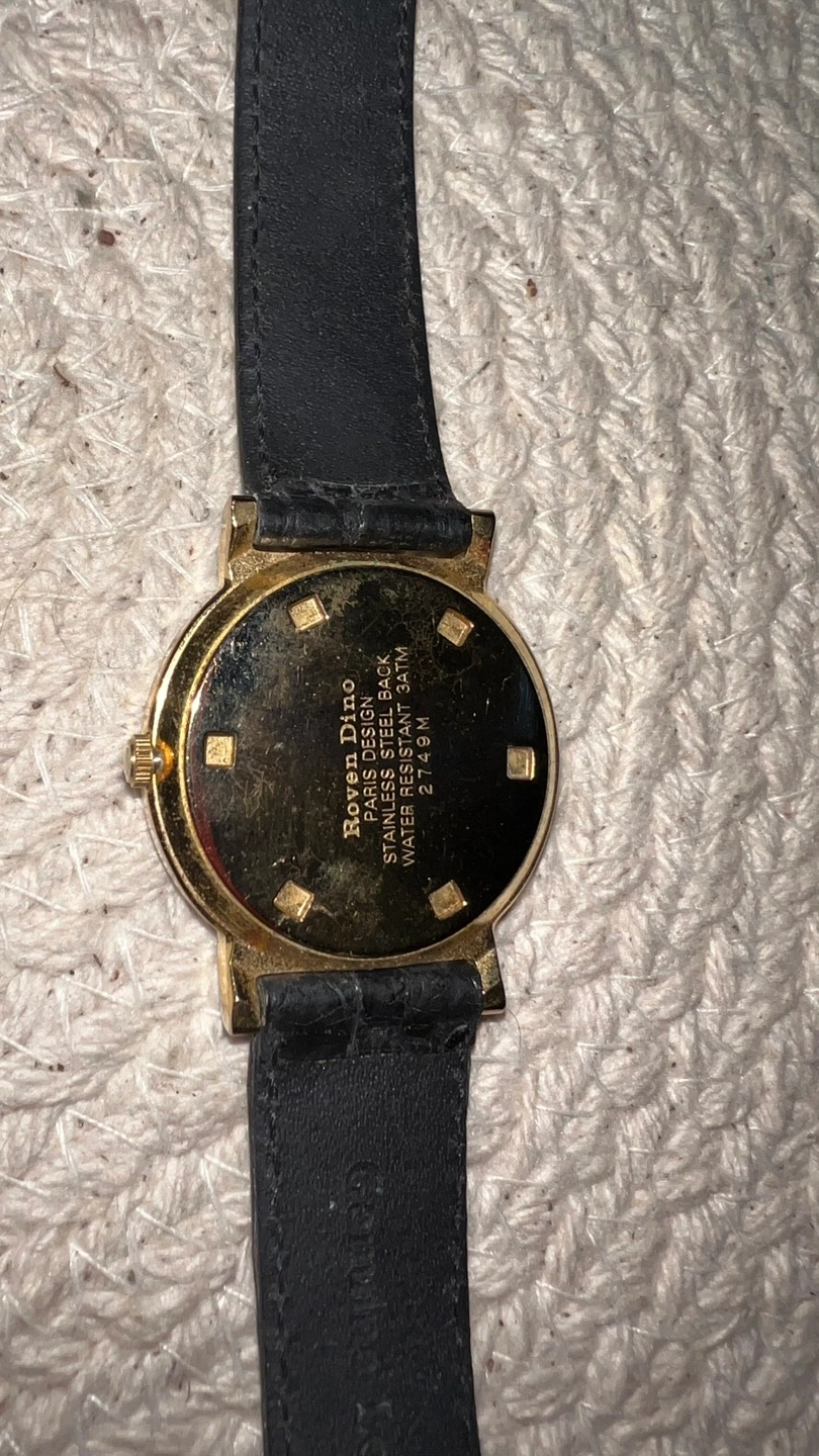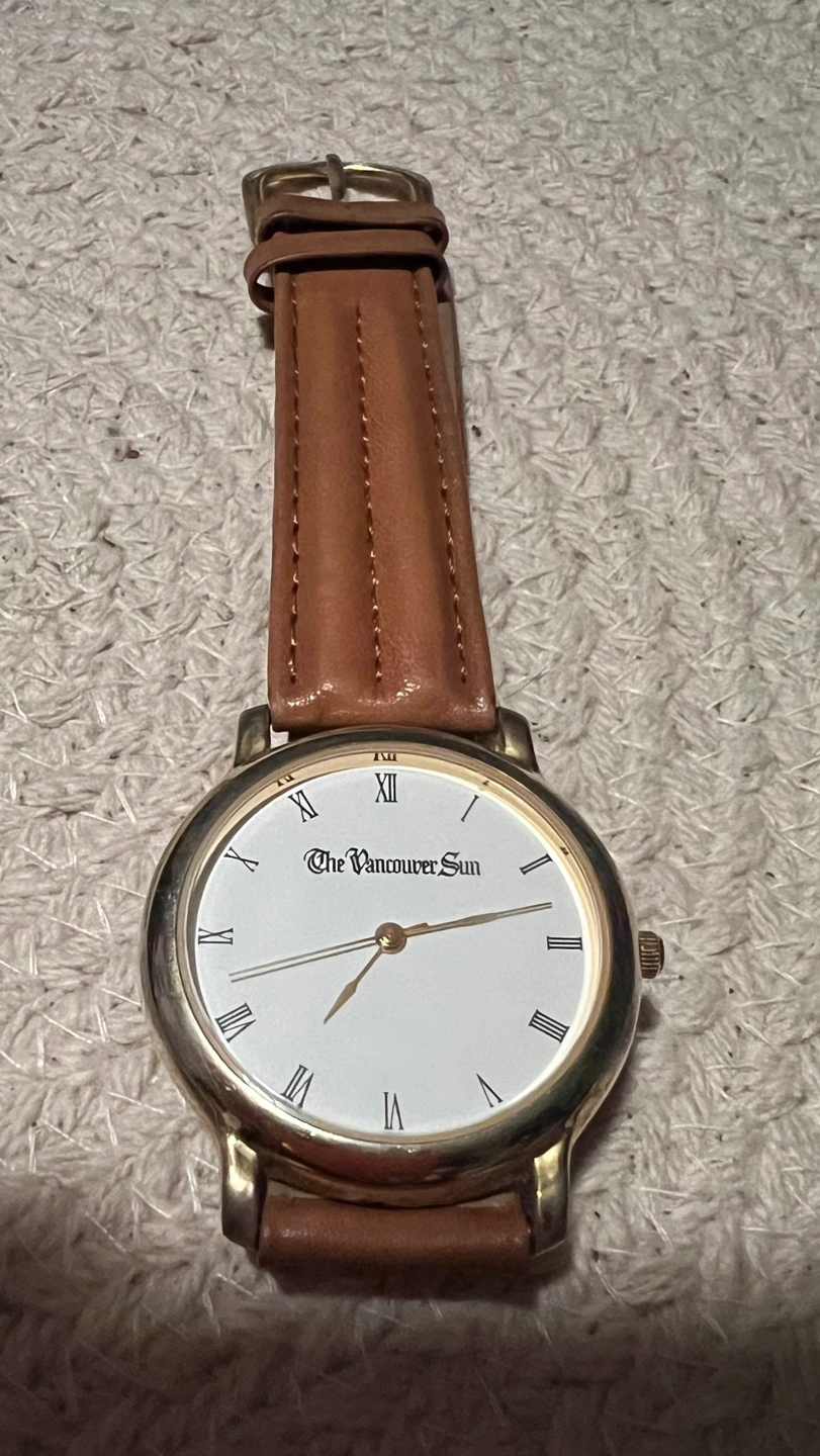 Three vintage watches. One features The Vancouver Sun logo, another shows the Province Classic Golf design, and the third displays the Canadian Pacific emblem. Leather straps. Pre-owned.