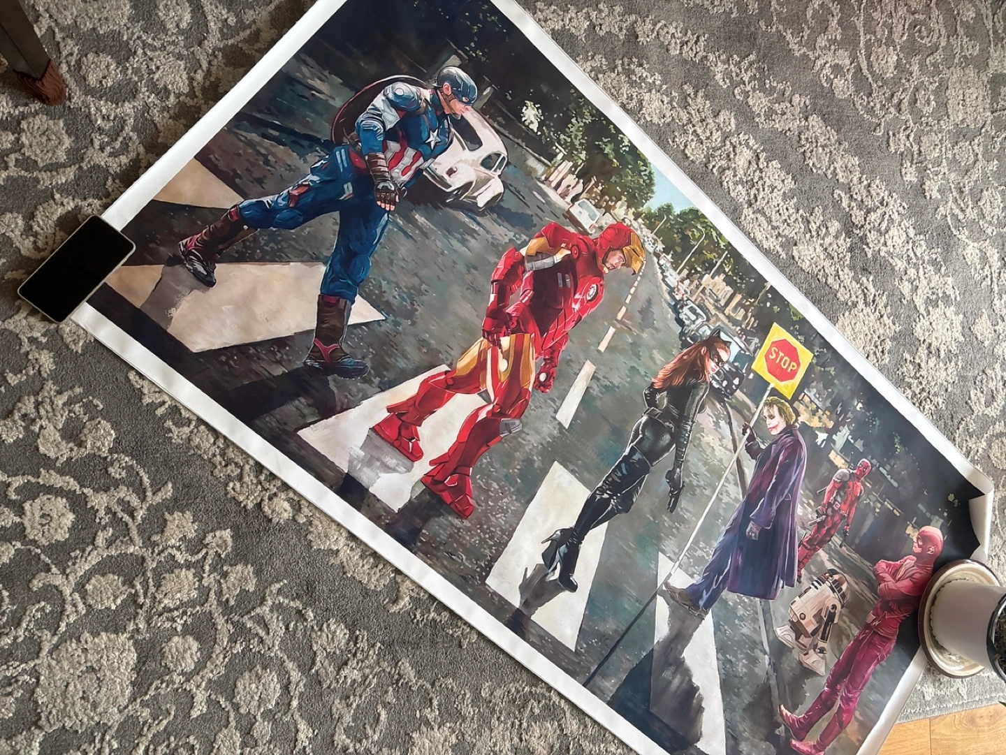 New, never used. Large canvas print featuring Marvel superheroes recreating the Beatles' Abbey Road album cover. Vibrant colours, great detail. Rolled up for easy transport.