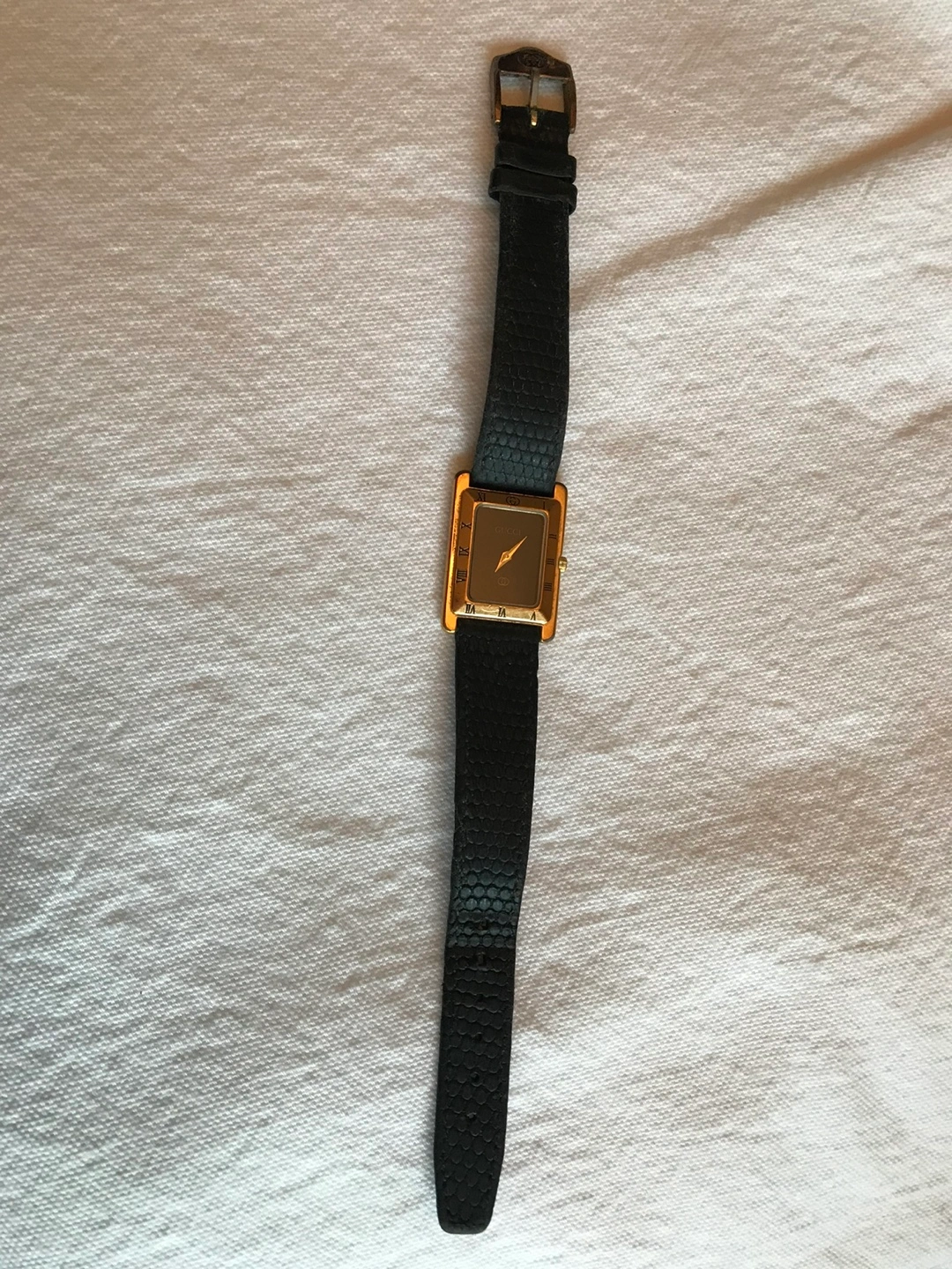 Vintage Gucci watch. Gold-tone square face. Black leather band. Classic design. Pre-owned.