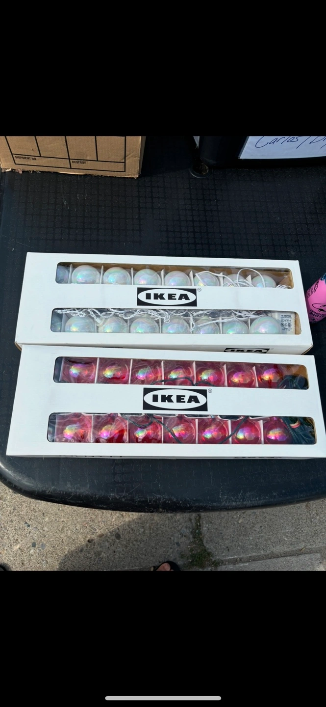Two sets of IKEA string lights. One white, one pink. Each set contains twelve iridescent bulbs. Like New, in original packaging.