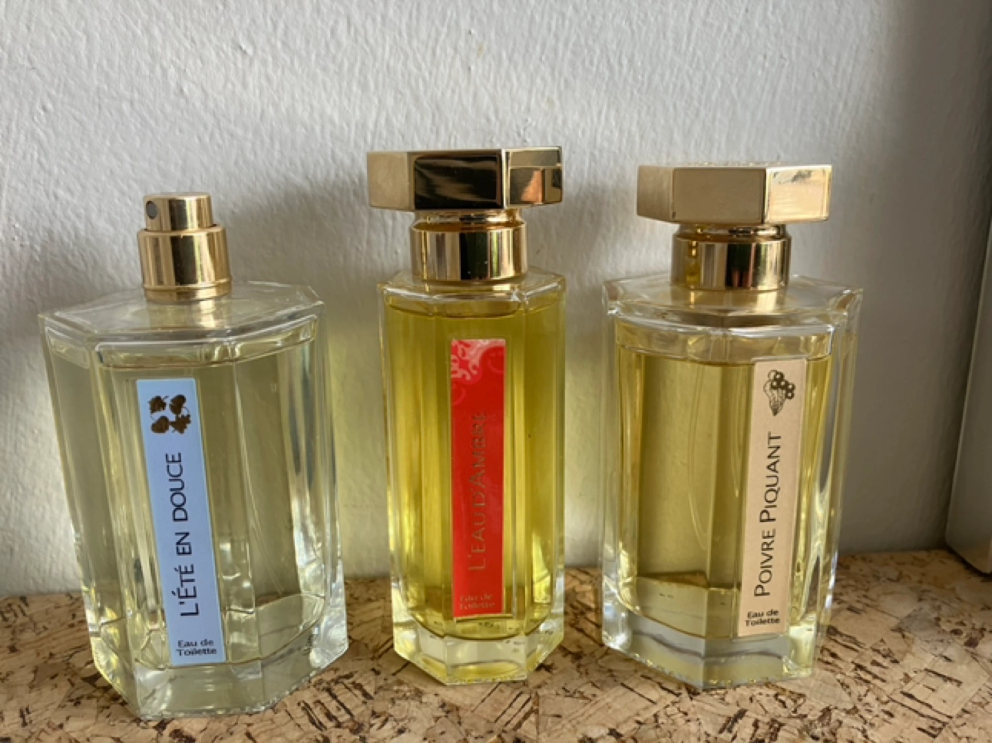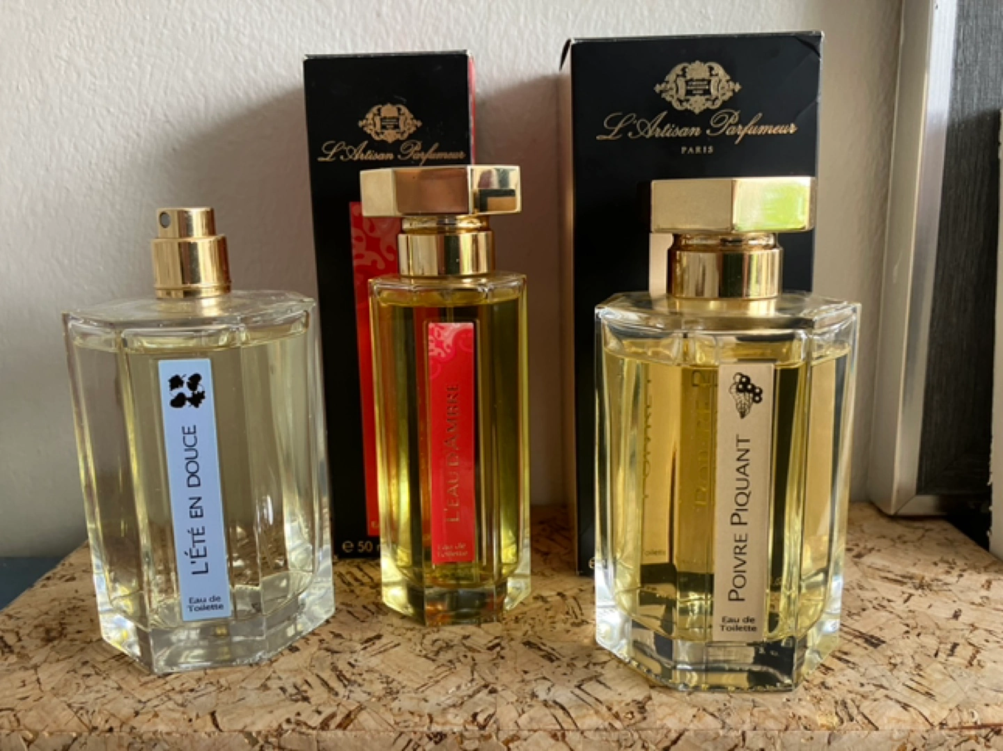 144Four L'Artisan Parfumeur perfumes for sale. Old packaging. L'été en Douce 100 ml. No cap, no box - sold L'Eau d'Ambre 50 ml -$55 Poivre Piquant, 100 ml - sold. Oeillet Sauvage, 100 ml - sold. All are around 95% full, please refer to pictures for juice level. Will consider serious offers only. No trades. All perfumes are from personal collection and were properly stored. Will be able to meet Toronto downtown, Yorkdale and East End (Broadview-Victoria Park subway stations).
