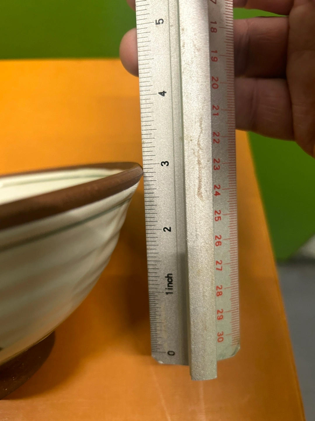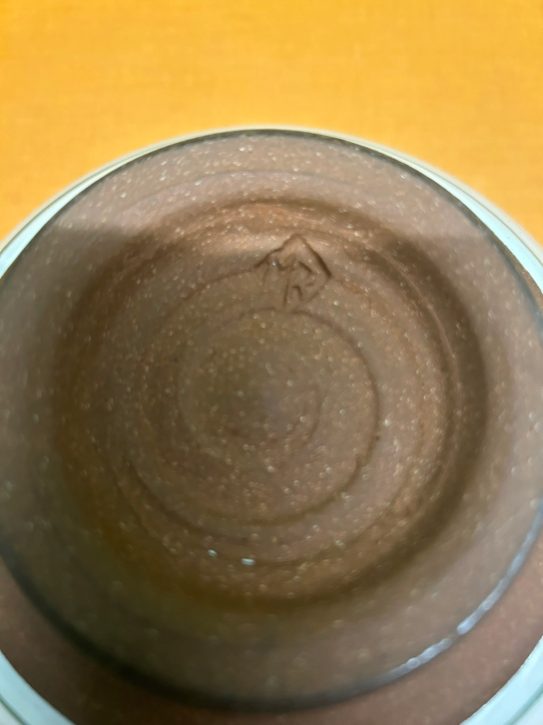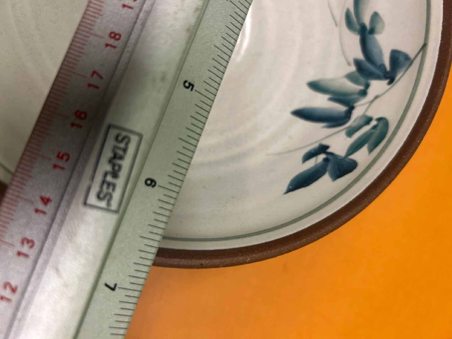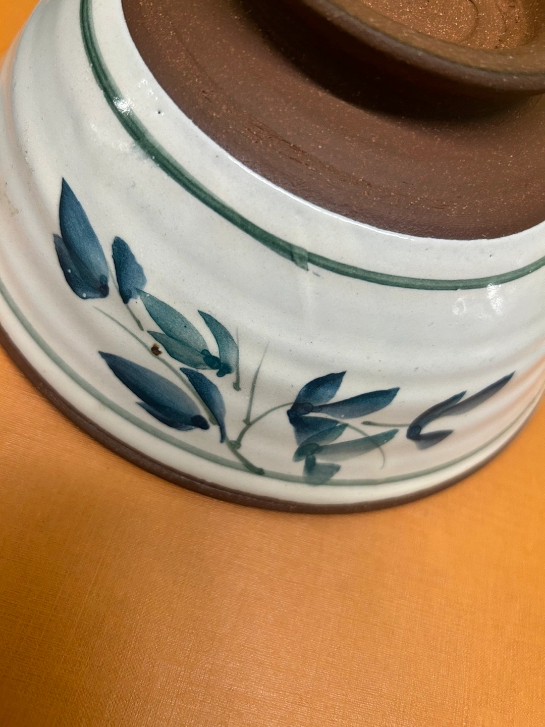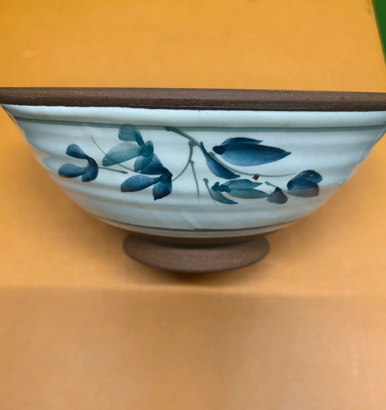 Unique ceramic bowl. Features a hand-painted design of hand painted blue leaves on a cream background. Brown rim and base. Small bowl, ideal for individual servings.