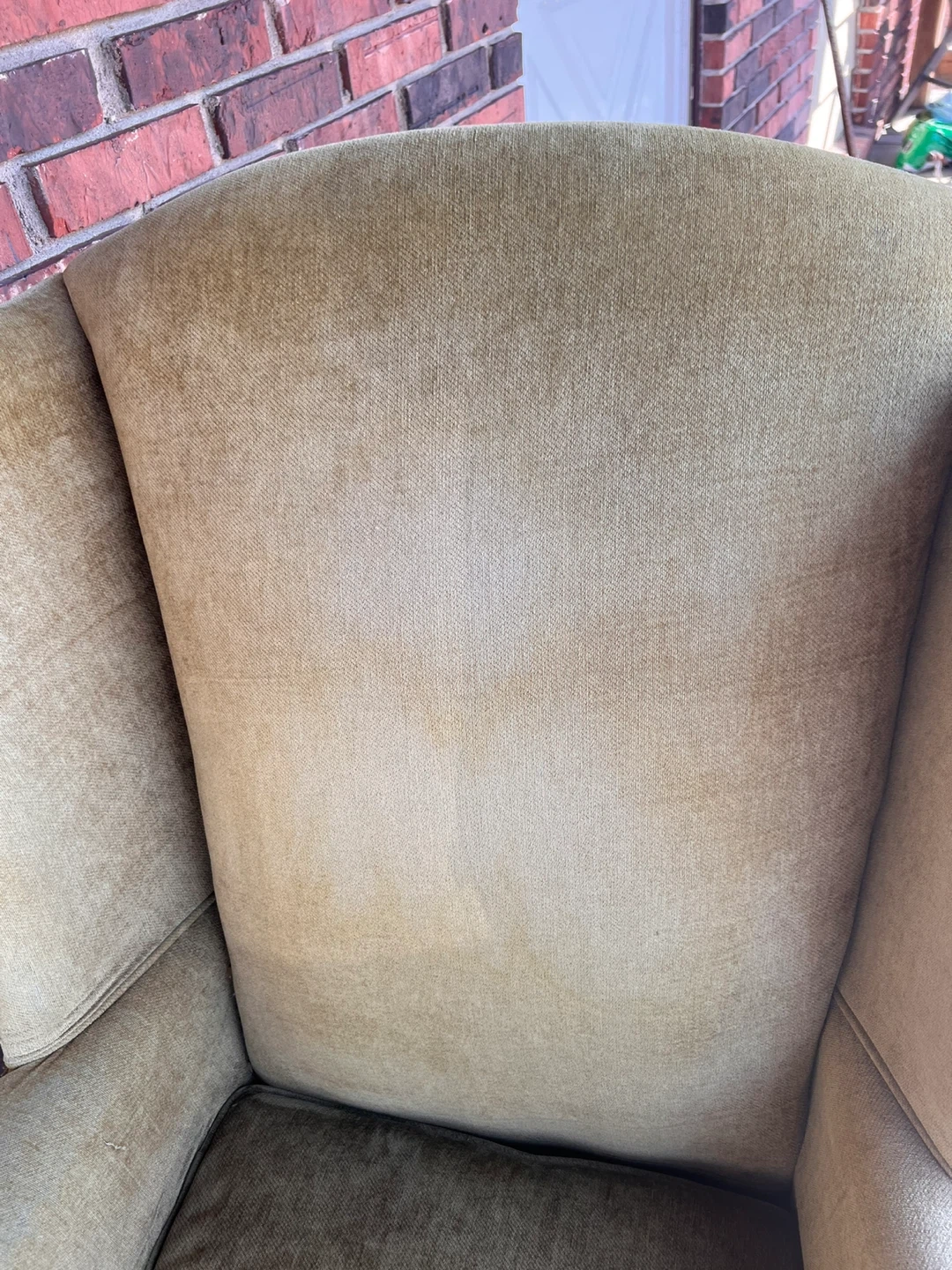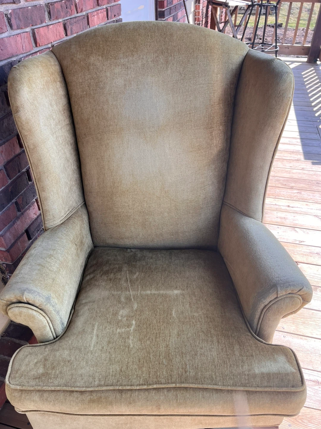 This is a classic wingback armchair upholstered in a mustard yellow fabric. It's a comfortable accent chair with a high back and padded arms. Some discoloration is present on the seat and back cushions.