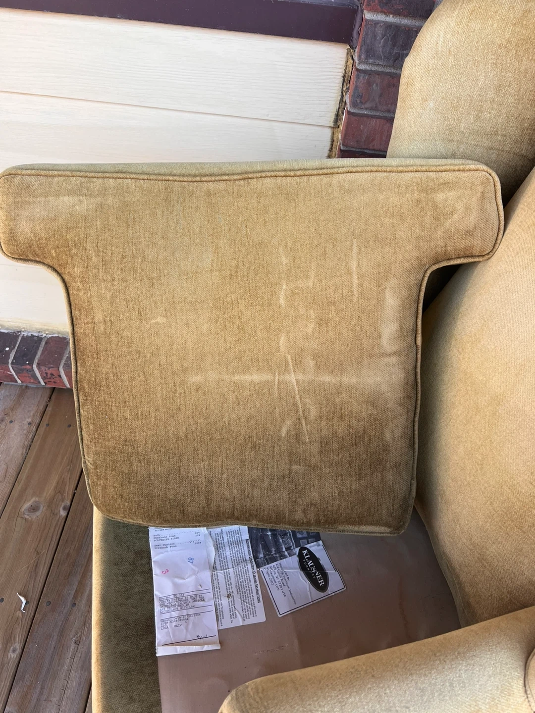 This is a classic wingback armchair upholstered in a mustard yellow fabric. It's a comfortable accent chair with a high back and padded arms. Some discoloration is present on the seat and back cushions.