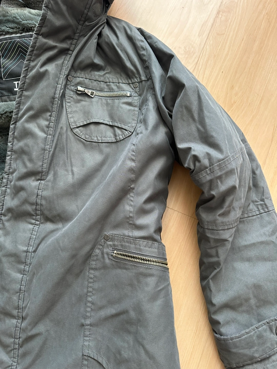 Warm winter coat. Long length. Features a hood with faux fur trim. Multiple pockets. Zipper and snap closure. Excellent condition.