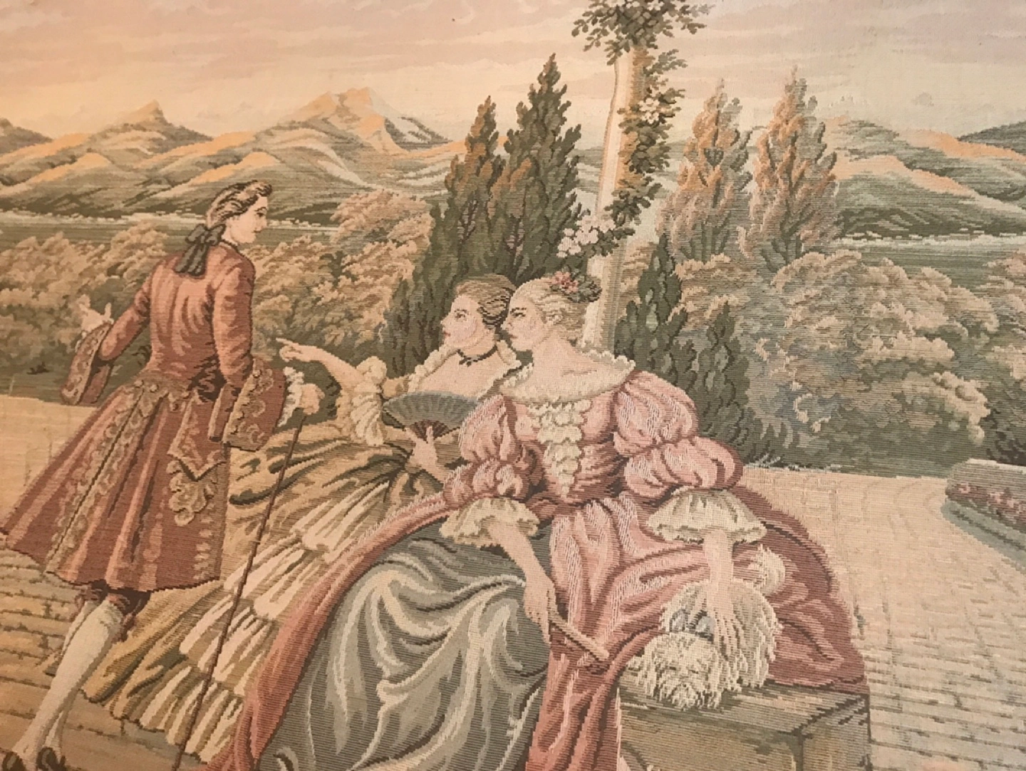 Large tapestry depicting a pastoral scene with elegantly dressed figures. Features a landscape background and intricate detailing. Housed in a beautiful ornate gold frame.