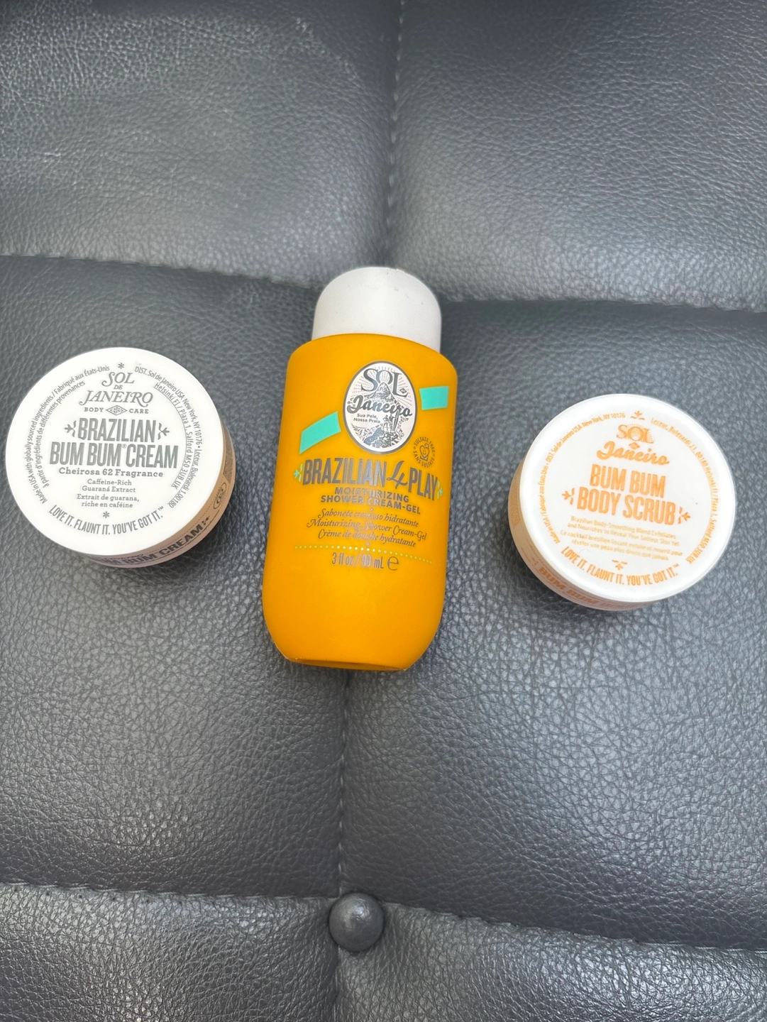 313Sol de Janeiro trio. Includes Bum Bum Cream, Brazilian 4 Play shower cream-gel, and Bum Bum Body Scrub. Travel-sized.