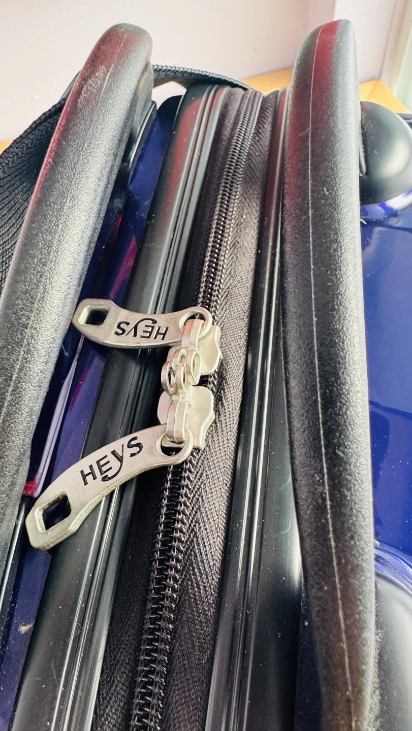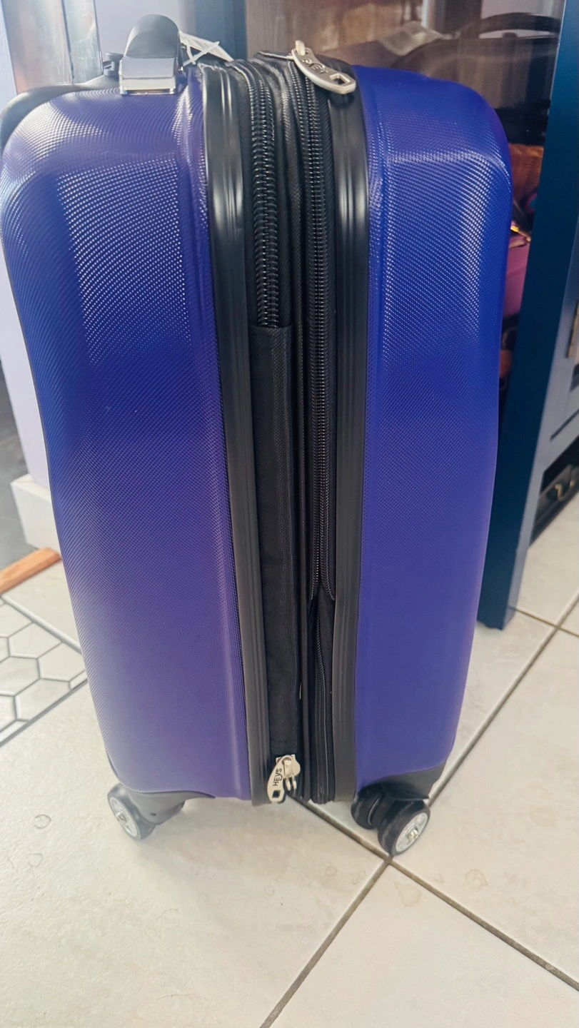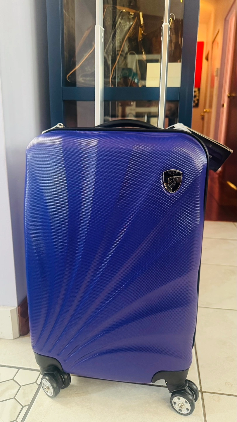 Purple carry-on suitcase. Lightweight design. Four spinner wheels. Telescopic handle. Multiple compartments. Excellent for travel.