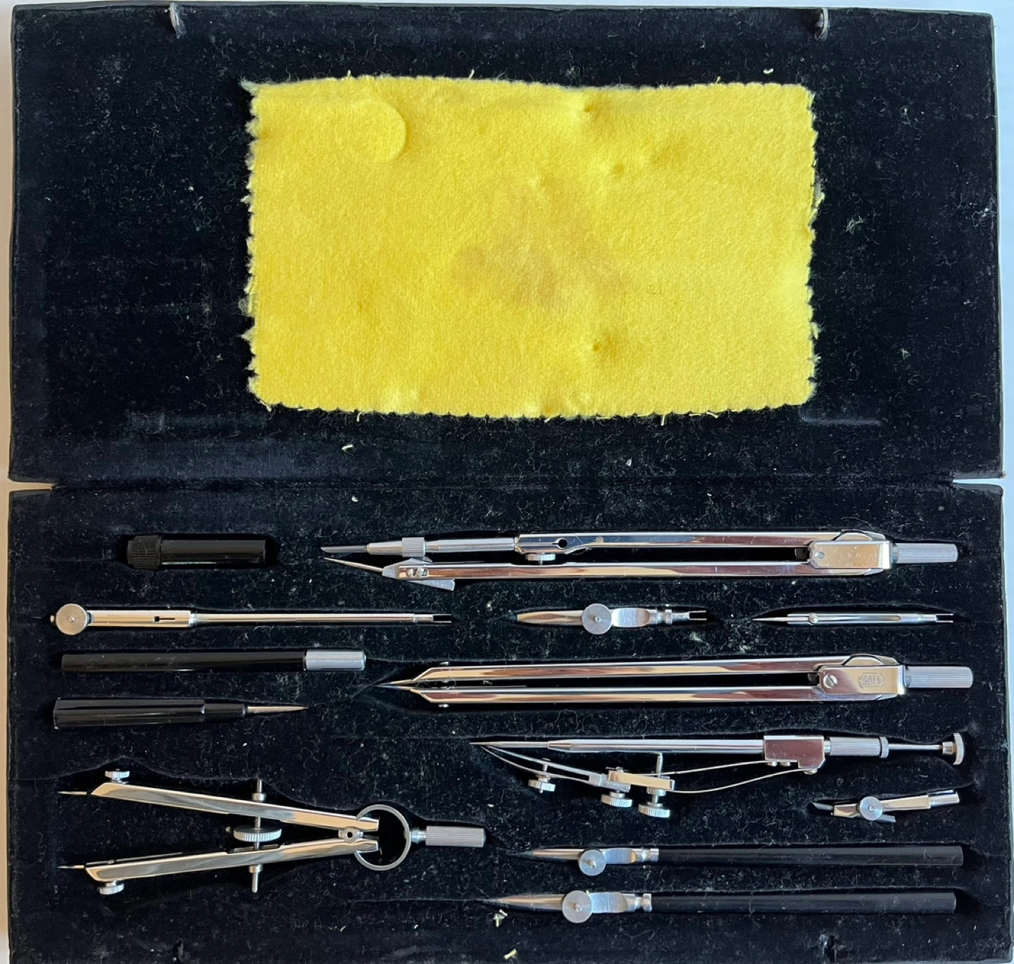 Complete set of drafting compasses. Includes various sizes and types. Stored in a black velvet-lined case. Only gently used. Yellow cleaning cloth included.