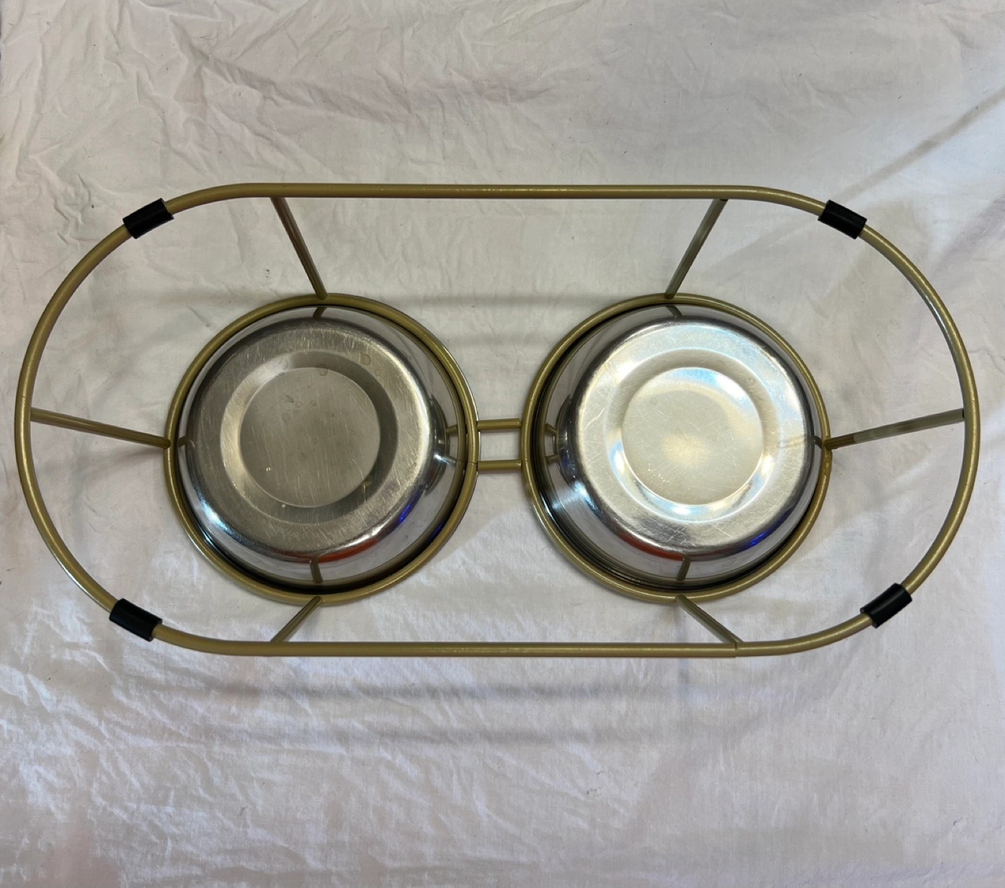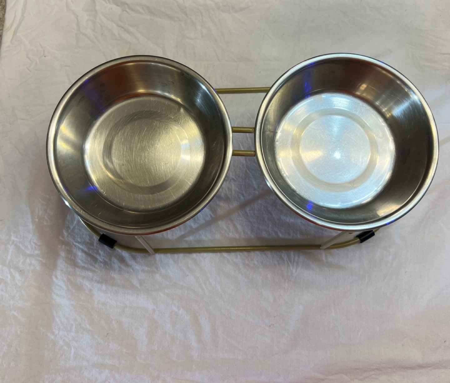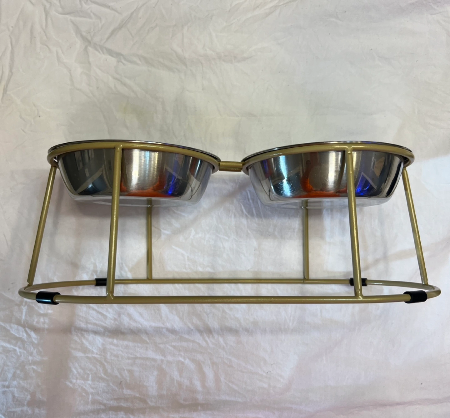 Stainless steel bowls size(5.5). Choose only 1-set either Gold or Silver bowl. Elevated stand. Gold-colored metal frame. Easy to clean. Great for cats and small dogs.