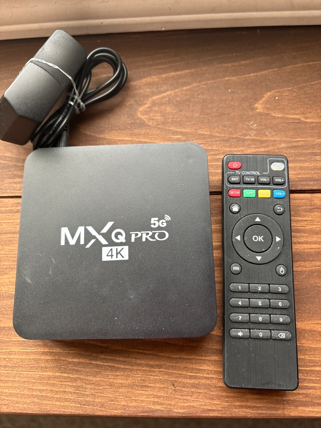 10MXQ PRO 4K Android TV box. Includes power adapter and remote. 5G WiFi.