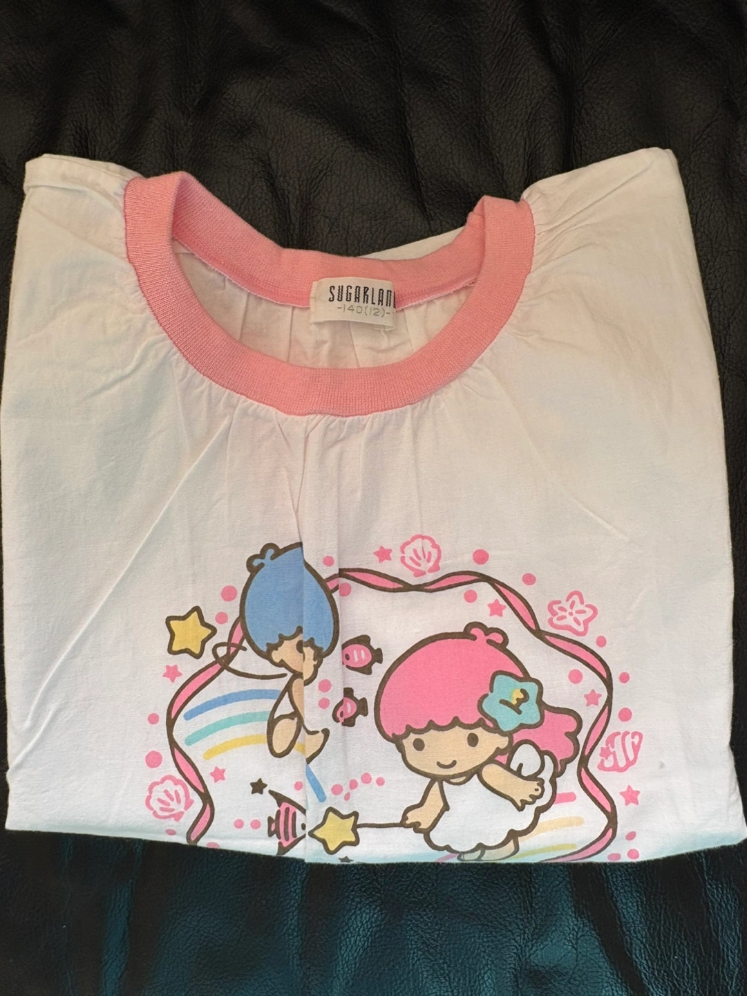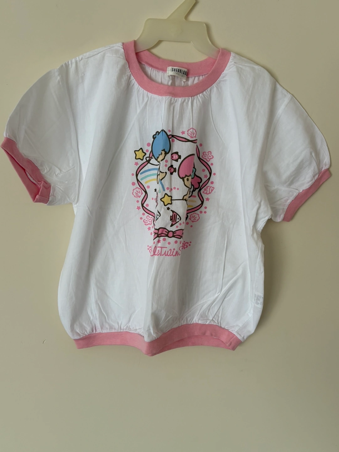 New Adorable Little Twin Stars graphic tee. White shirt with pink trim. Short sleeves. Great for summer. Size 130. Brand: Sugarland