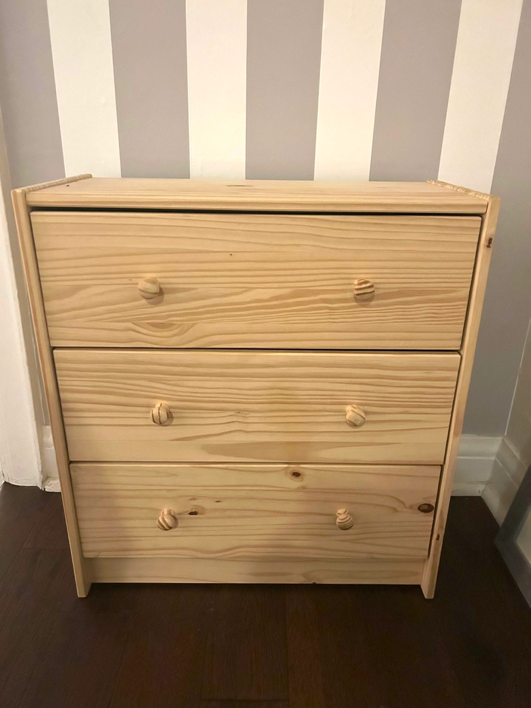 Small IKEA three-drawer dresser, unfinished light pine wood. Smoke-free/pet-free home. Pick-up only. Retails for $100.