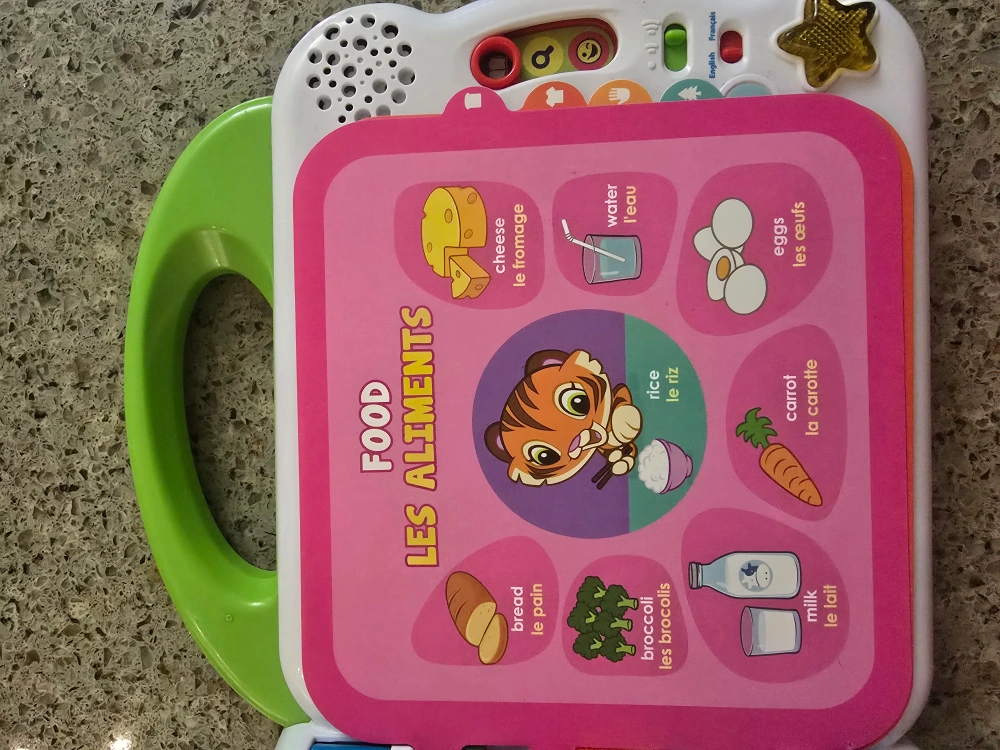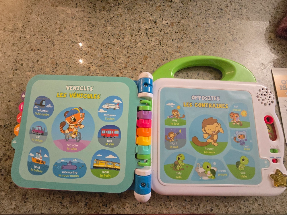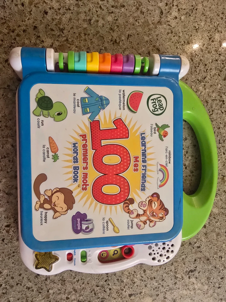 Pre-owned LeapFrog 100 Words Book. Interactive bilingual learning toy. Features various categories including food, vehicles, opposites, animals, and more. Great for toddlers learning English and French.