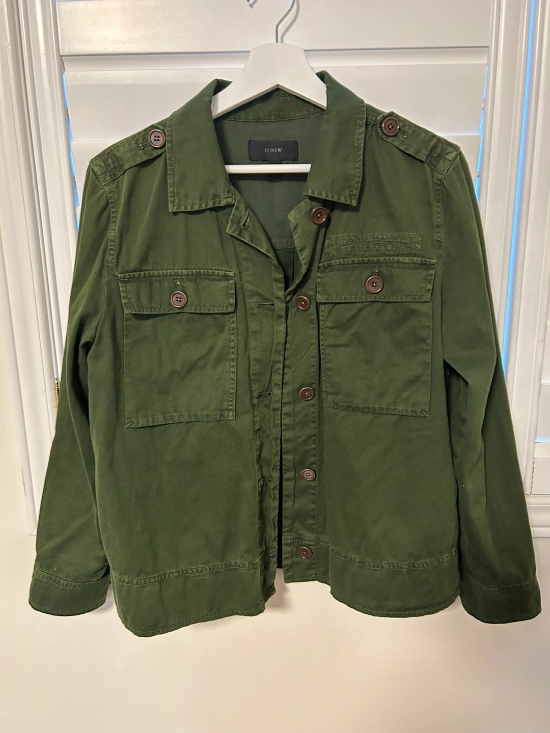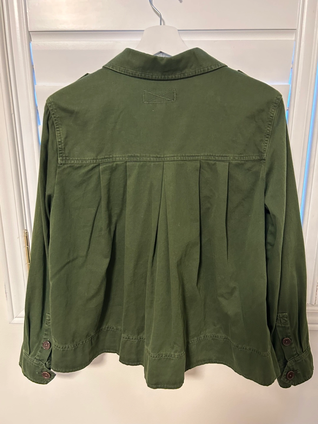 Long sleeves, button closure, multiple pockets. Relaxed fit. Good color.