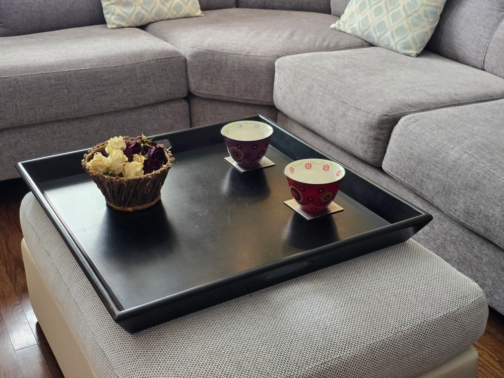 Extra large square serving tray. It is a solid and heavy wood tray that won't slide around on your ottoman or table.