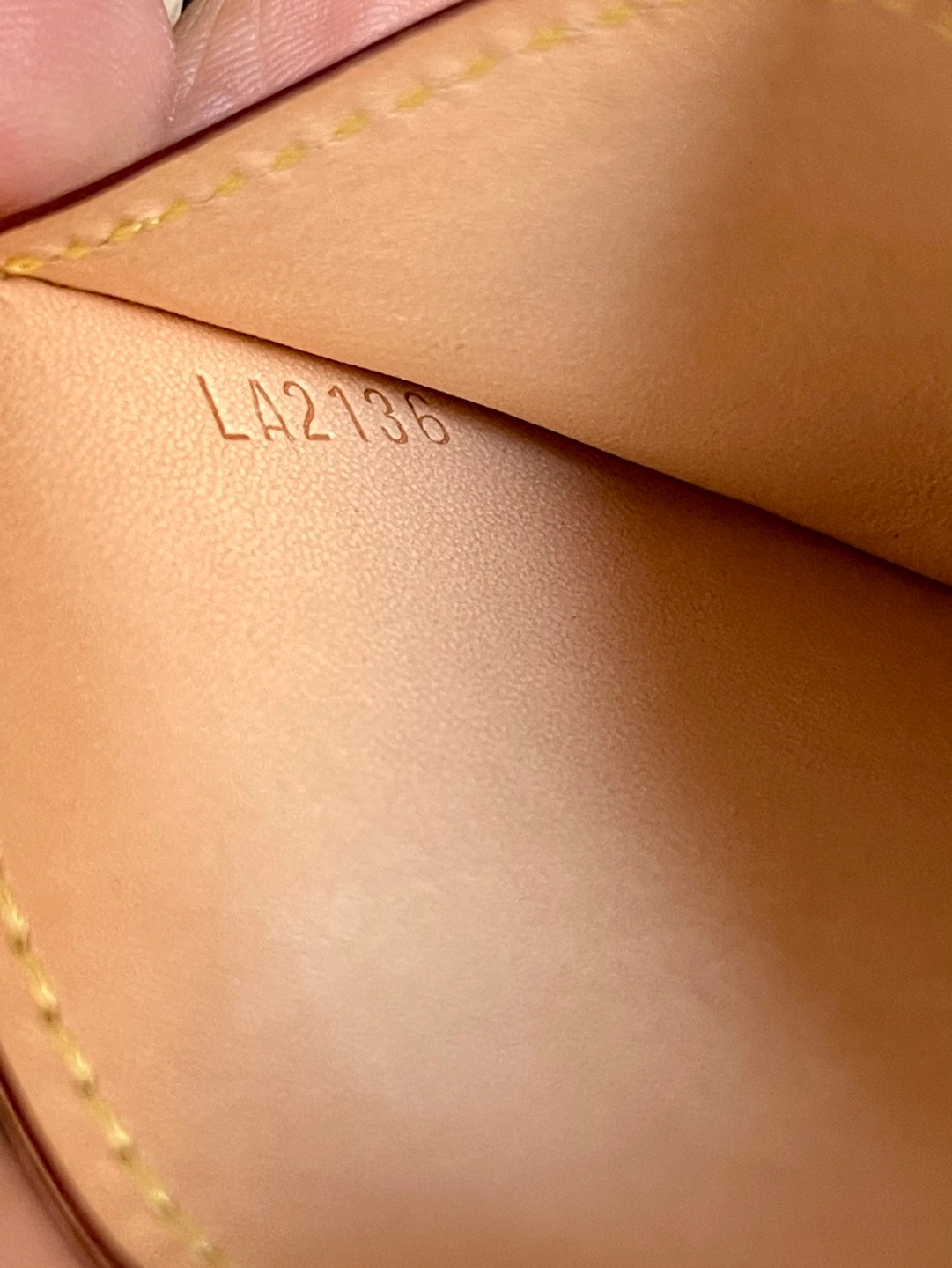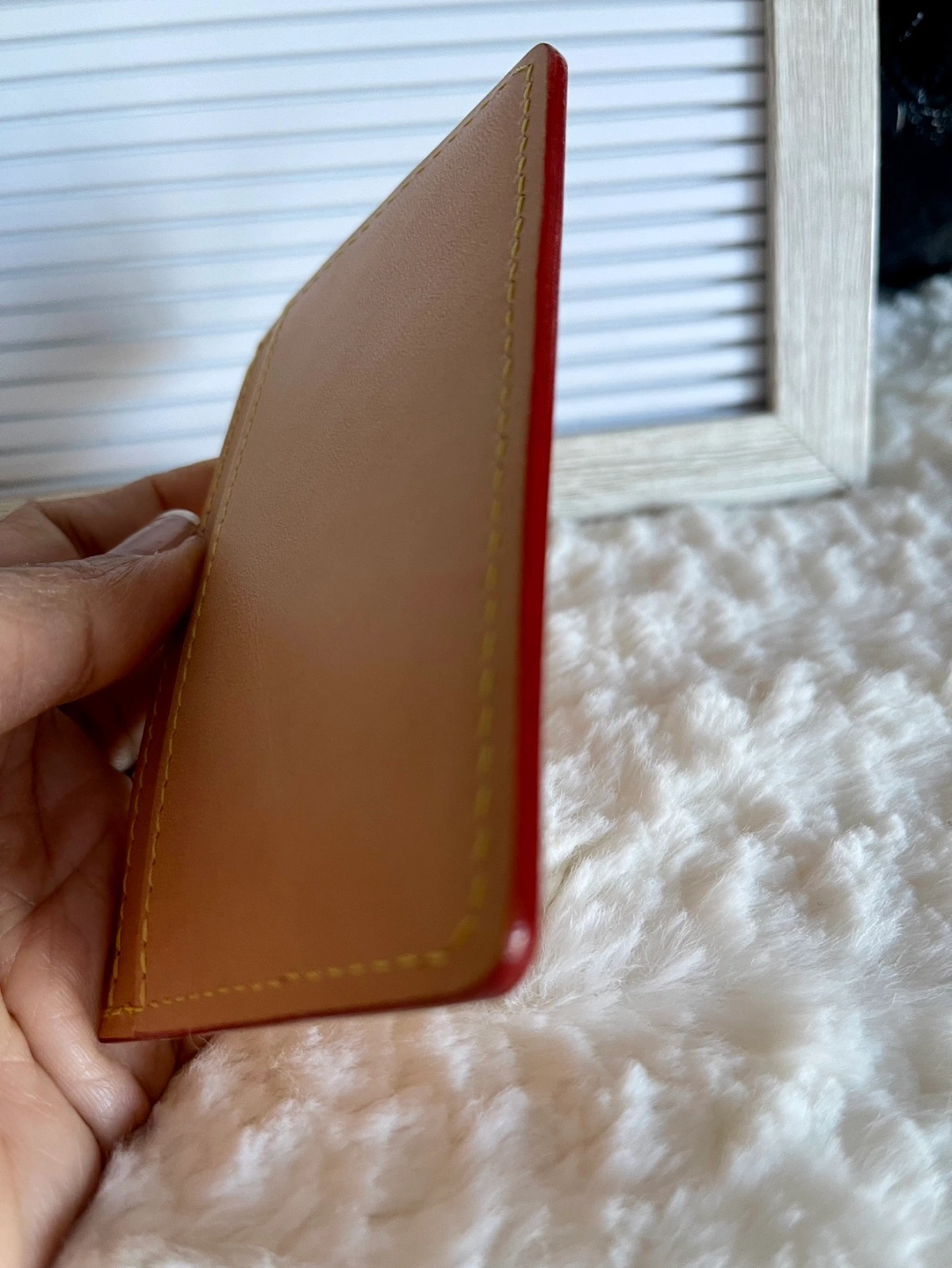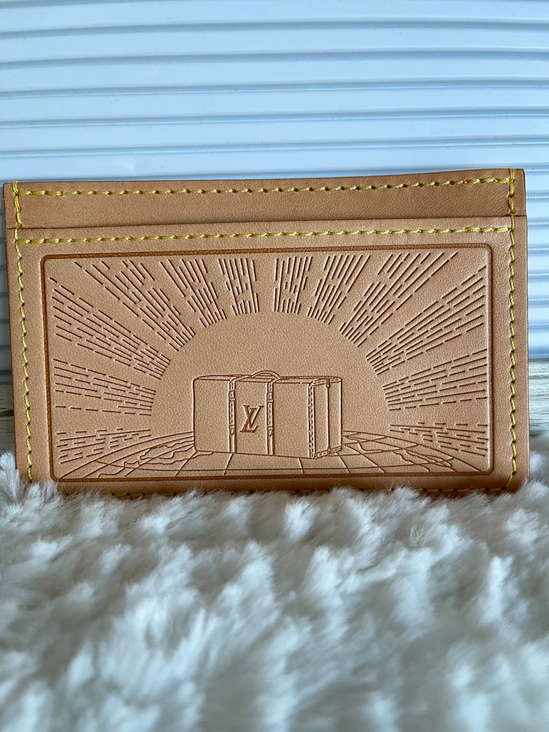 Beige leather card holder. Yellow stitching. Subtle Louis Vuitton luggage graphic on one side. Multiple card slots. Pick up east Maple Ridge