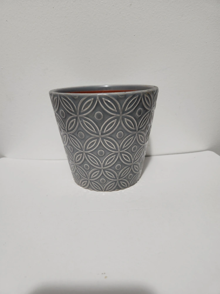 Small grey ceramic planter pot. Features an embossed geometric pattern. Perfect for small plants or succulents.