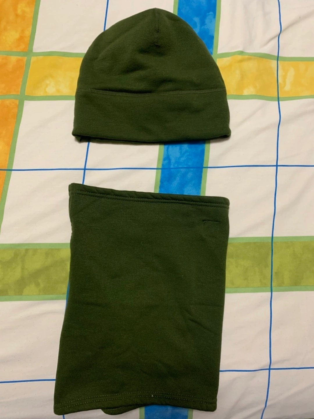 Warm olive green fleece hat and neck gaiter. Perfect for cold weather. Soft and comfortable material. Great for outdoor activities.