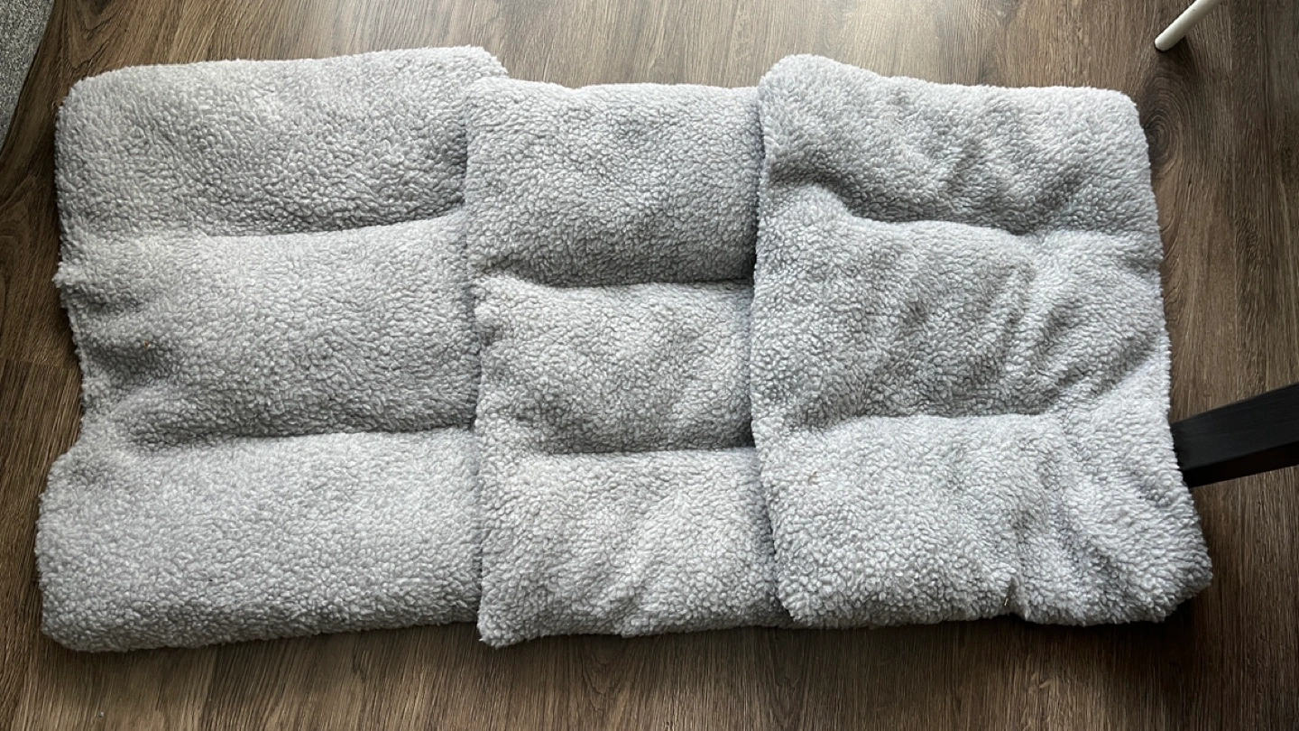 Three-piece grey sherpa pet bed mat. Soft and cozy. Perfect for small to medium-sized pets.