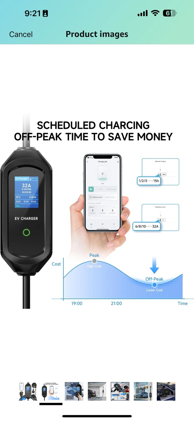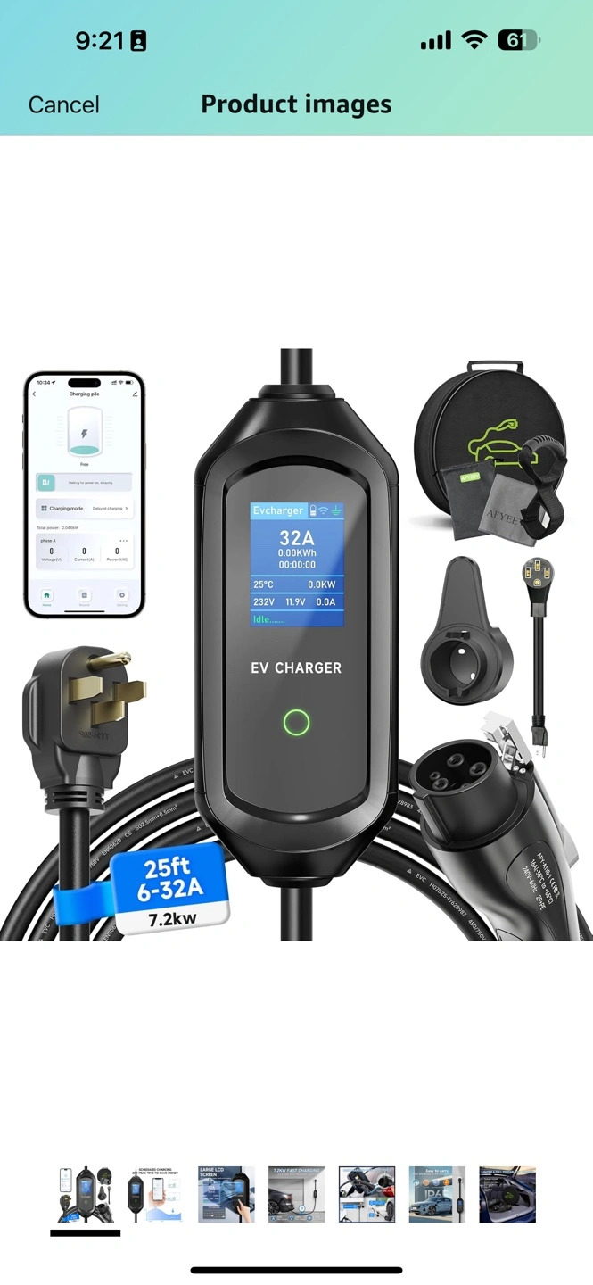 Portable EV charger, 25ft cable. Features scheduled charging and a large LCD screen. Supports Type 1 SAE J1772 and NEMA 14-50 plugs. Fast charging up to 7.2kW. Includes adapters.