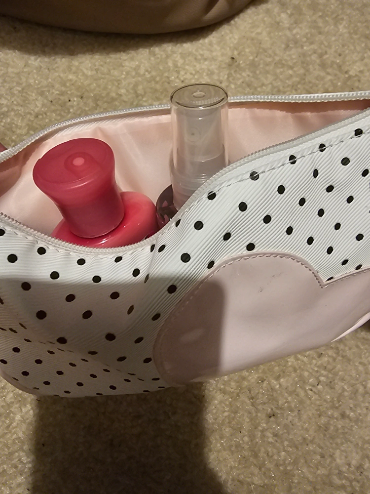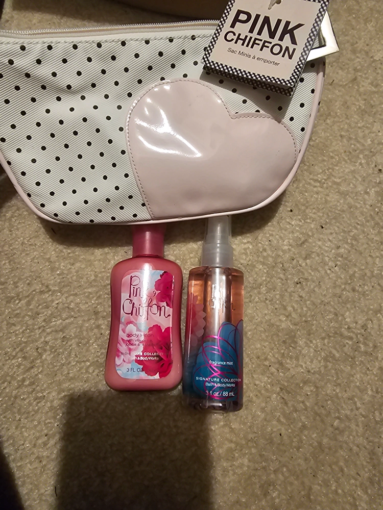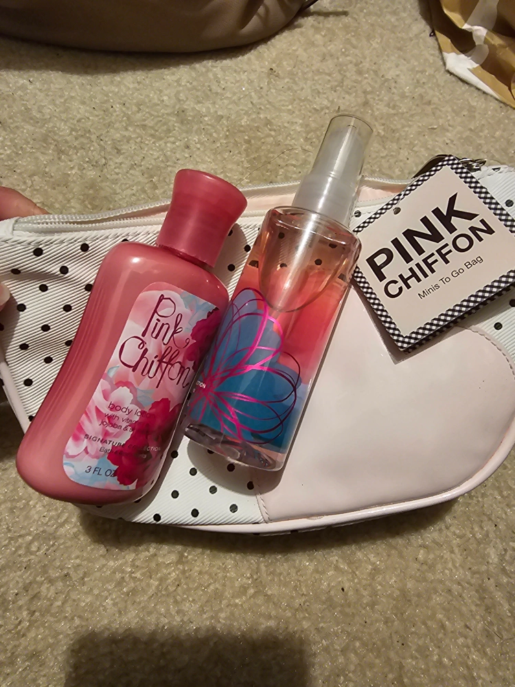 Adorable polka dot cosmetic bag. Includes Pink Chiffon body lotion and fragrance mist. Perfect for travel.