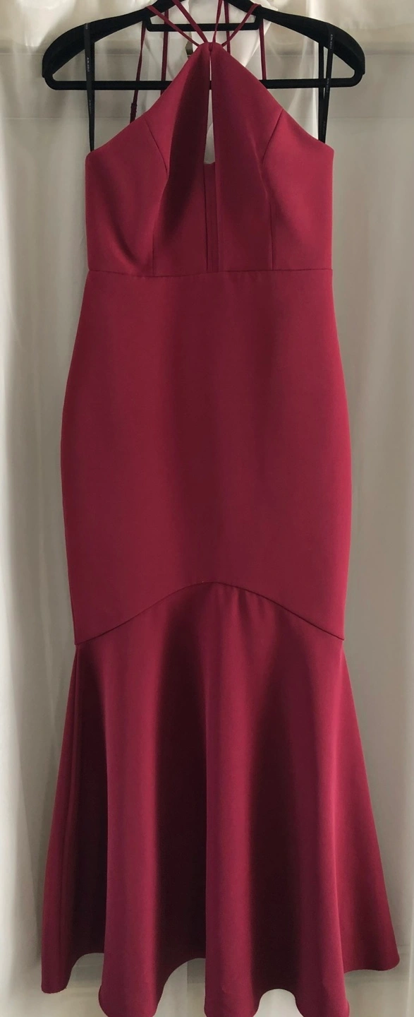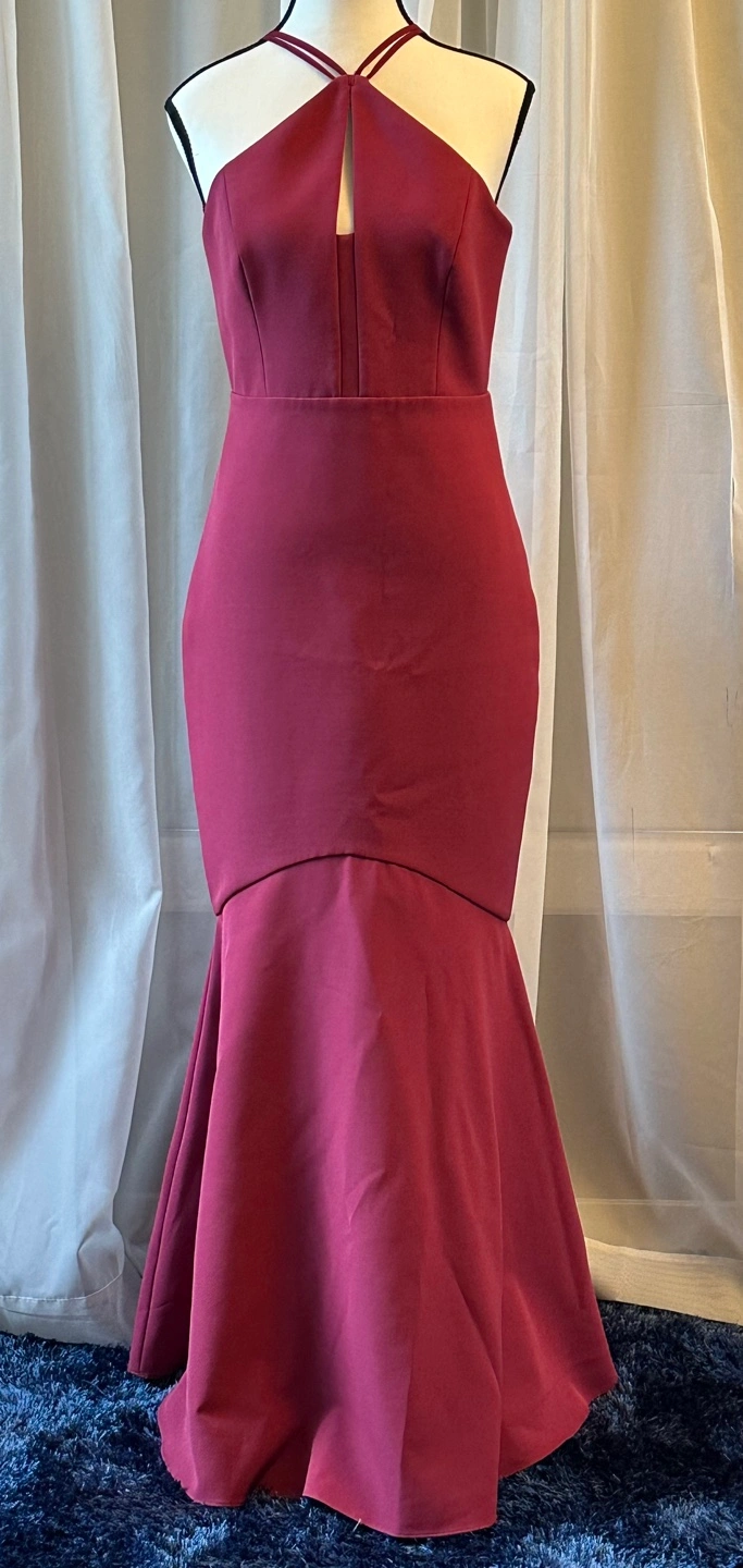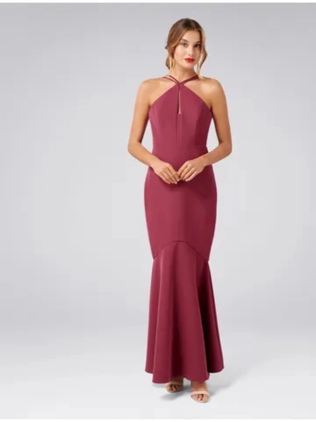 Stunning berry colour maxi dress. Halter neck, figure-hugging silhouette. Features a flattering fishtail skirt. Perfect for a formal occasion.