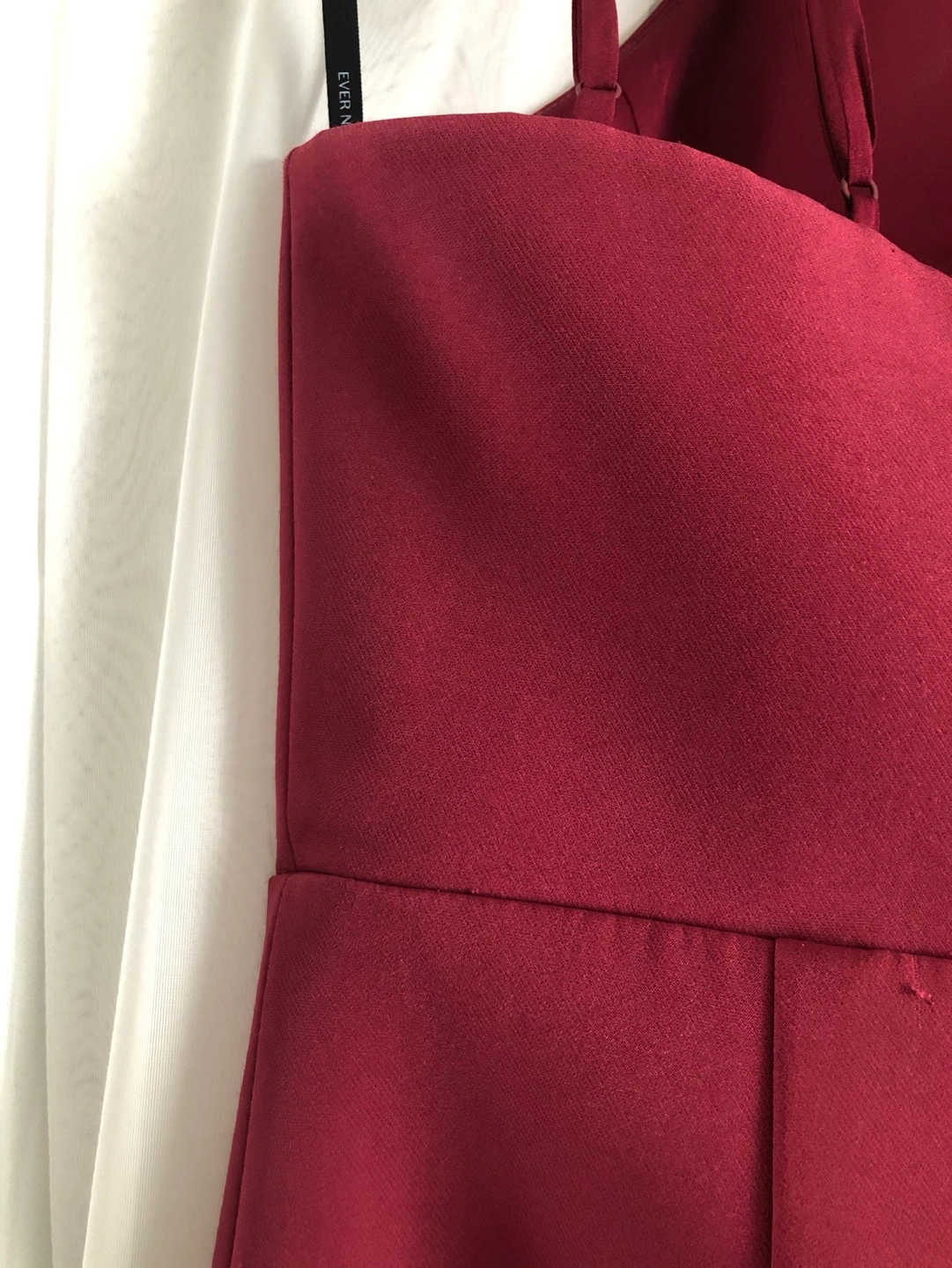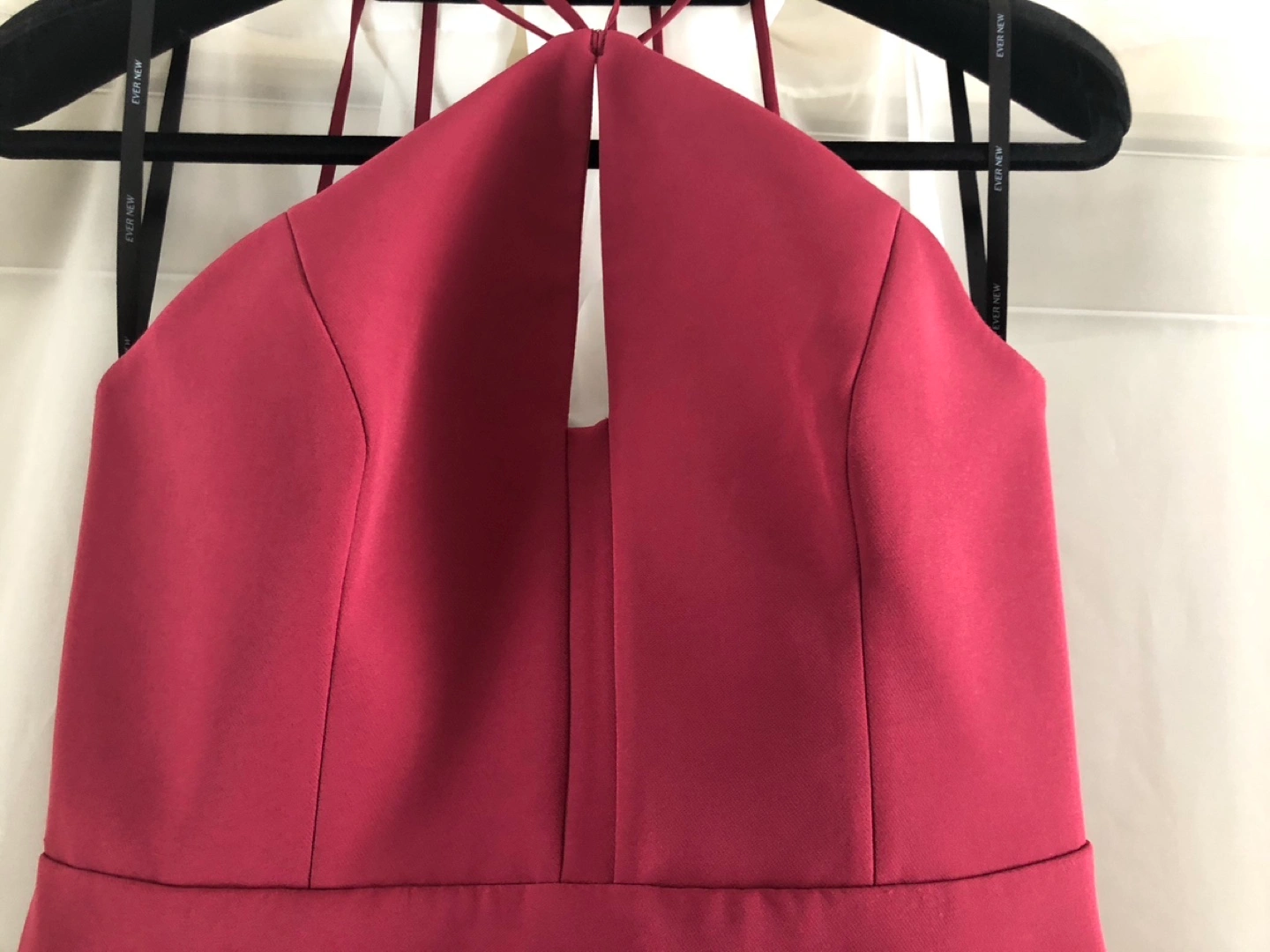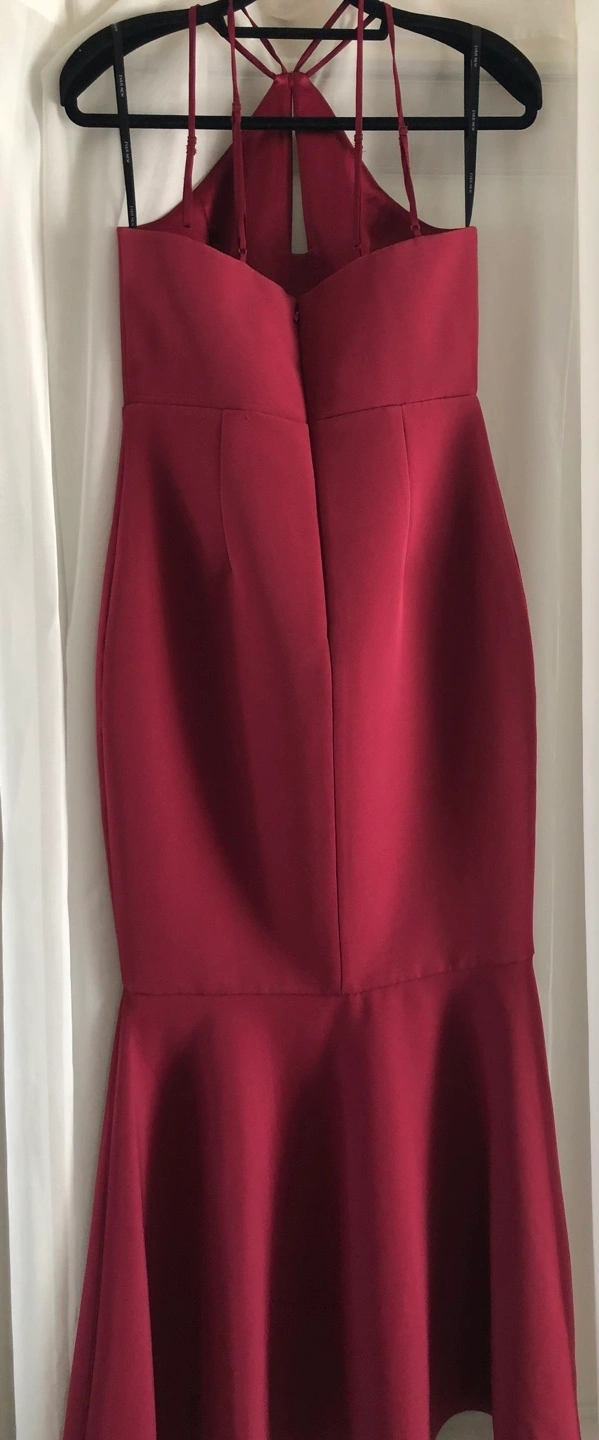Stunning berry colour maxi dress. Halter neck, figure-hugging silhouette. Features a flattering fishtail skirt. Perfect for a formal occasion.