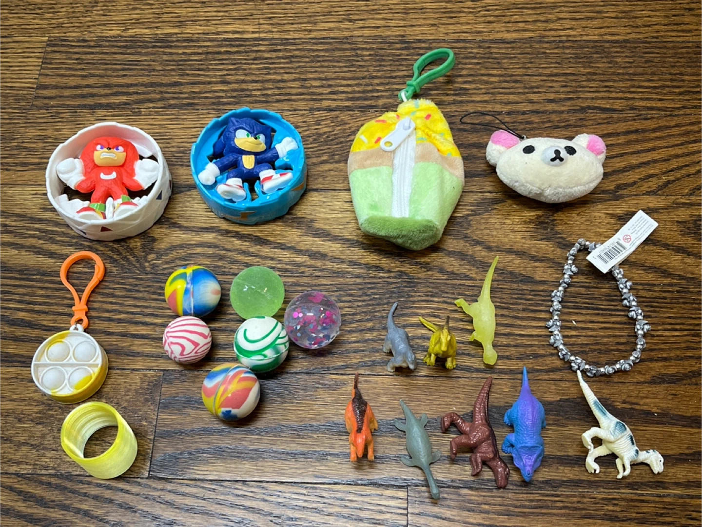 A fun collection of small toys! Includes Sonic and Knuckles figures in their containers, a Rilakkuma-style keychain, a pop-it fidget toy, bouncy balls, and several dinosaur figures. It's a great assortment for kids or collectors!