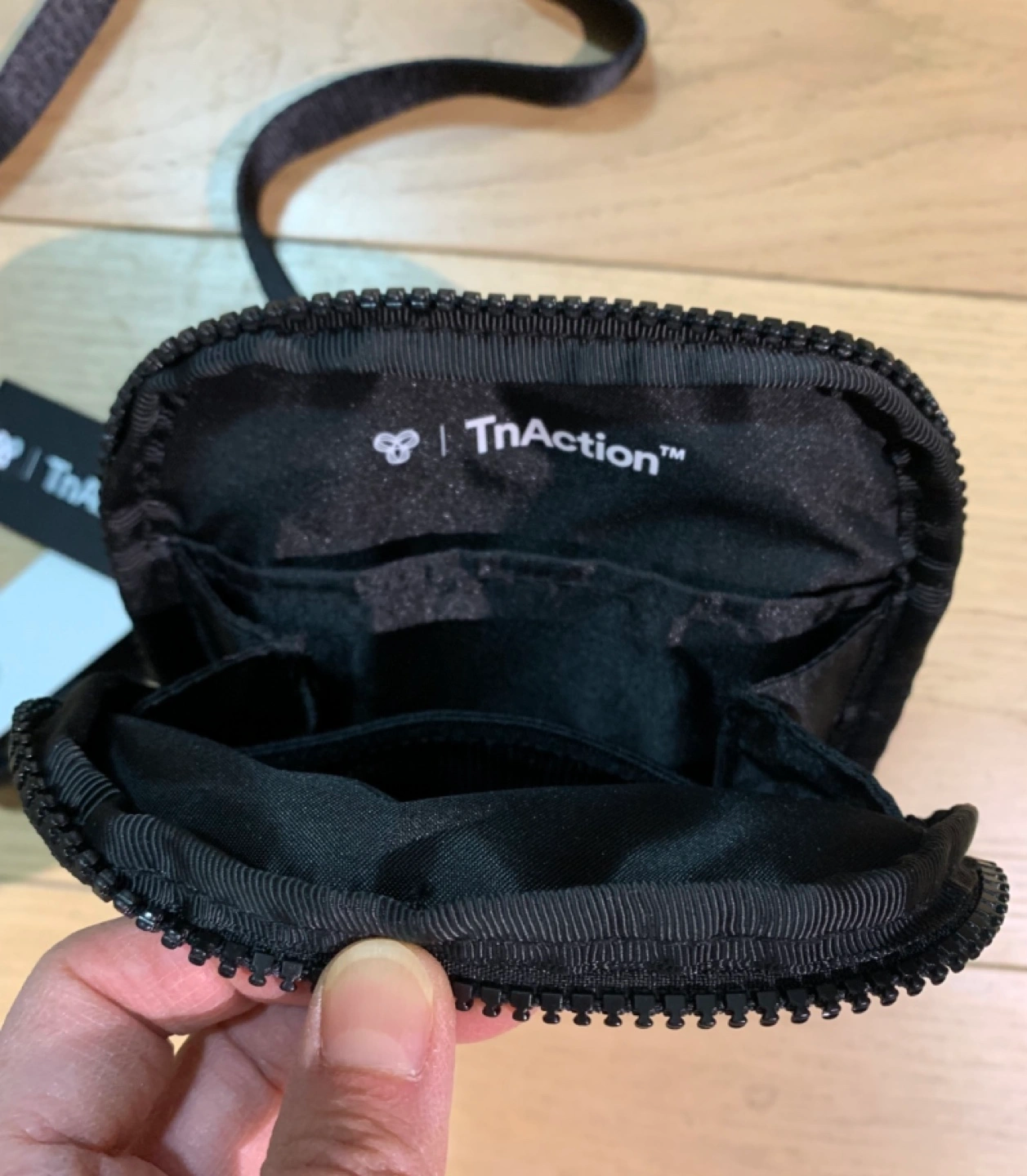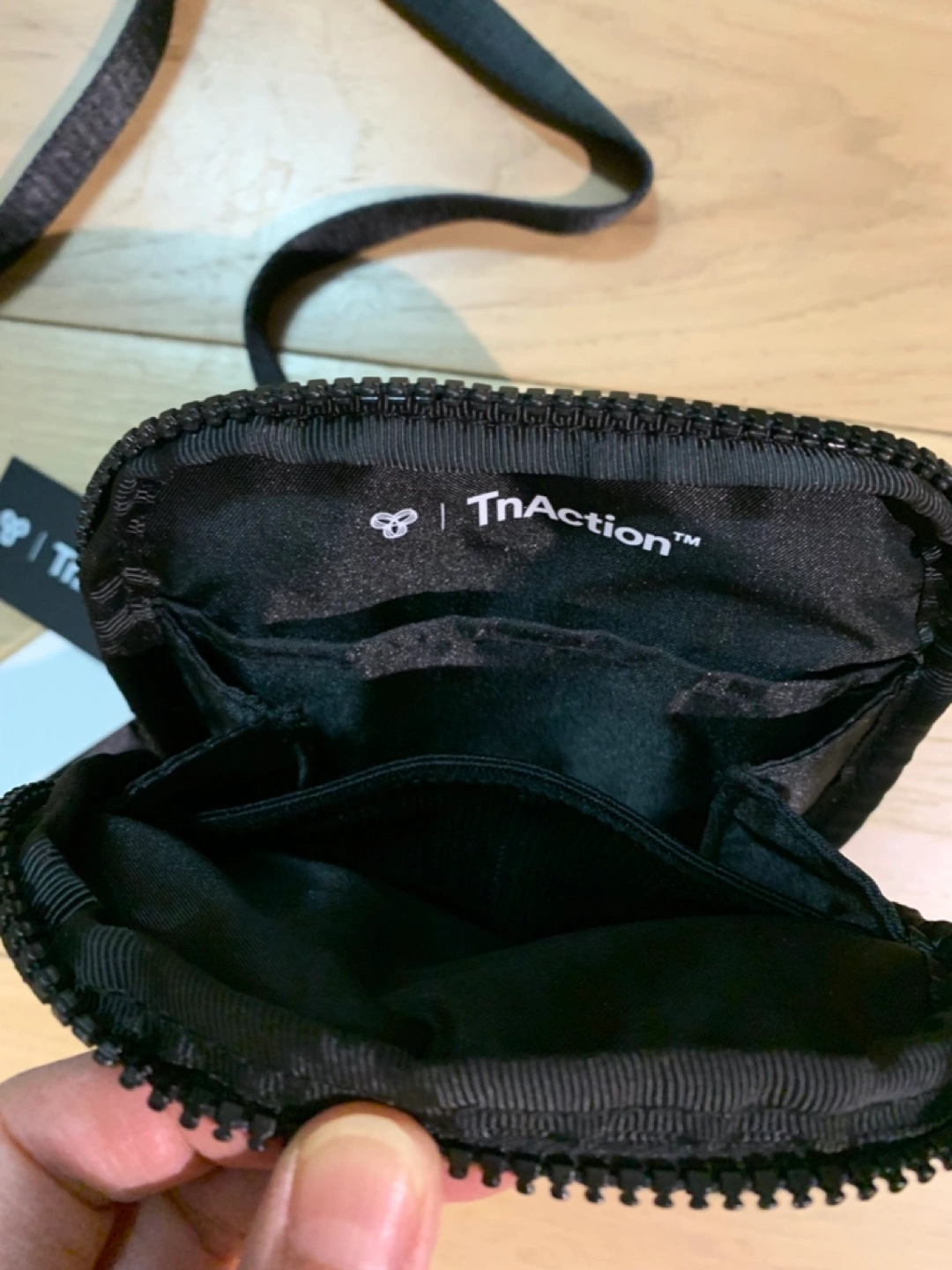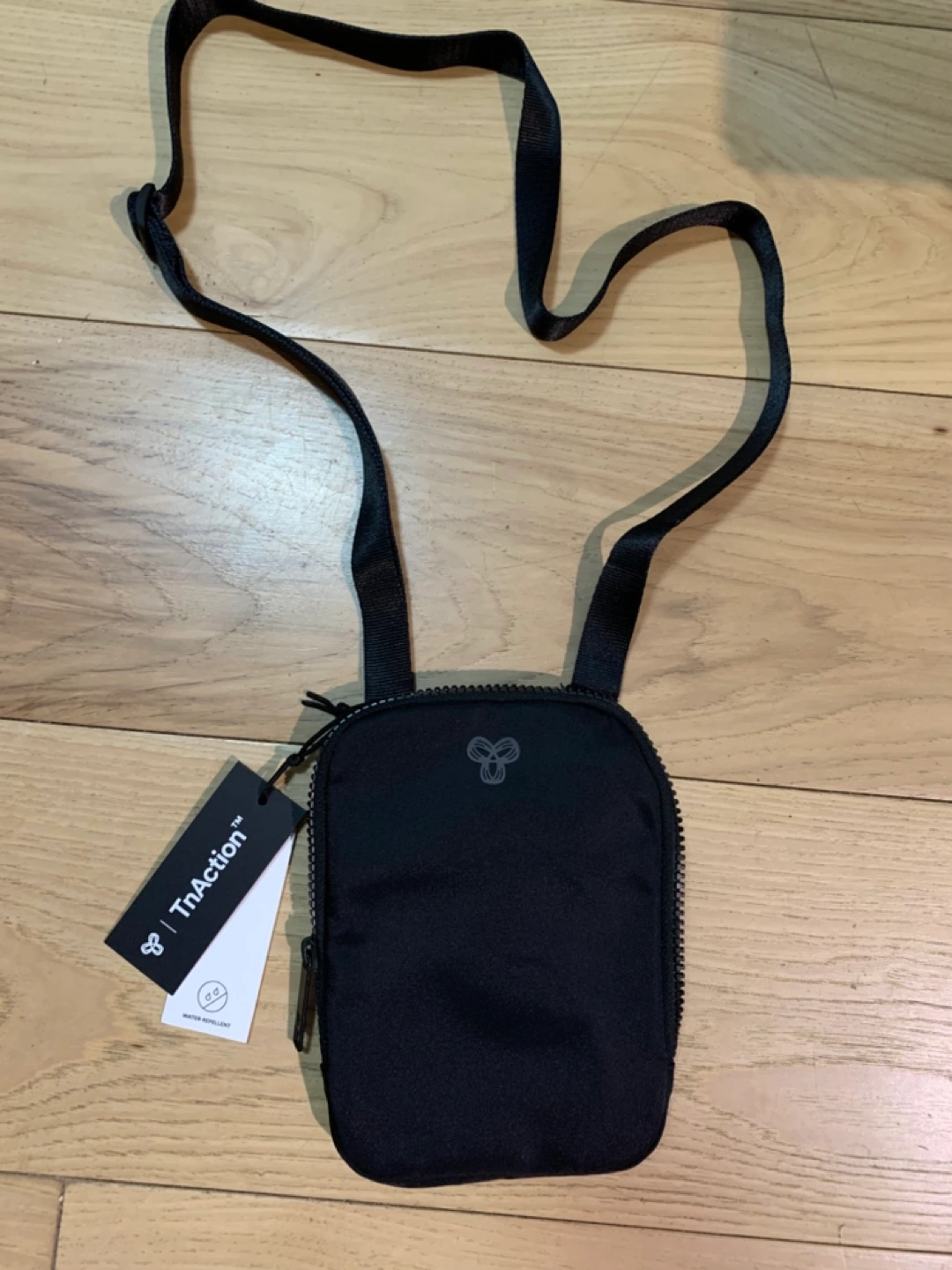 Small black crossbody bag. Features zipper closure and adjustable strap. Water-repellent material. Multiple interior pockets. Great for a night out if you only want to carry cell phone, credit cards, keys and lip gloss.