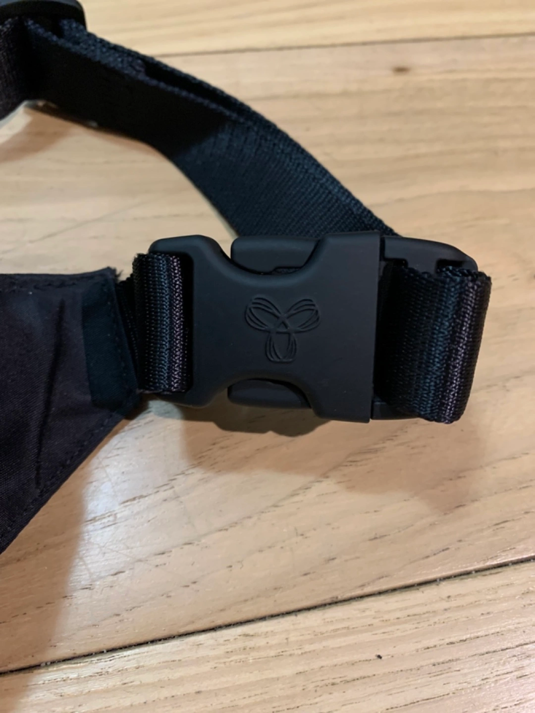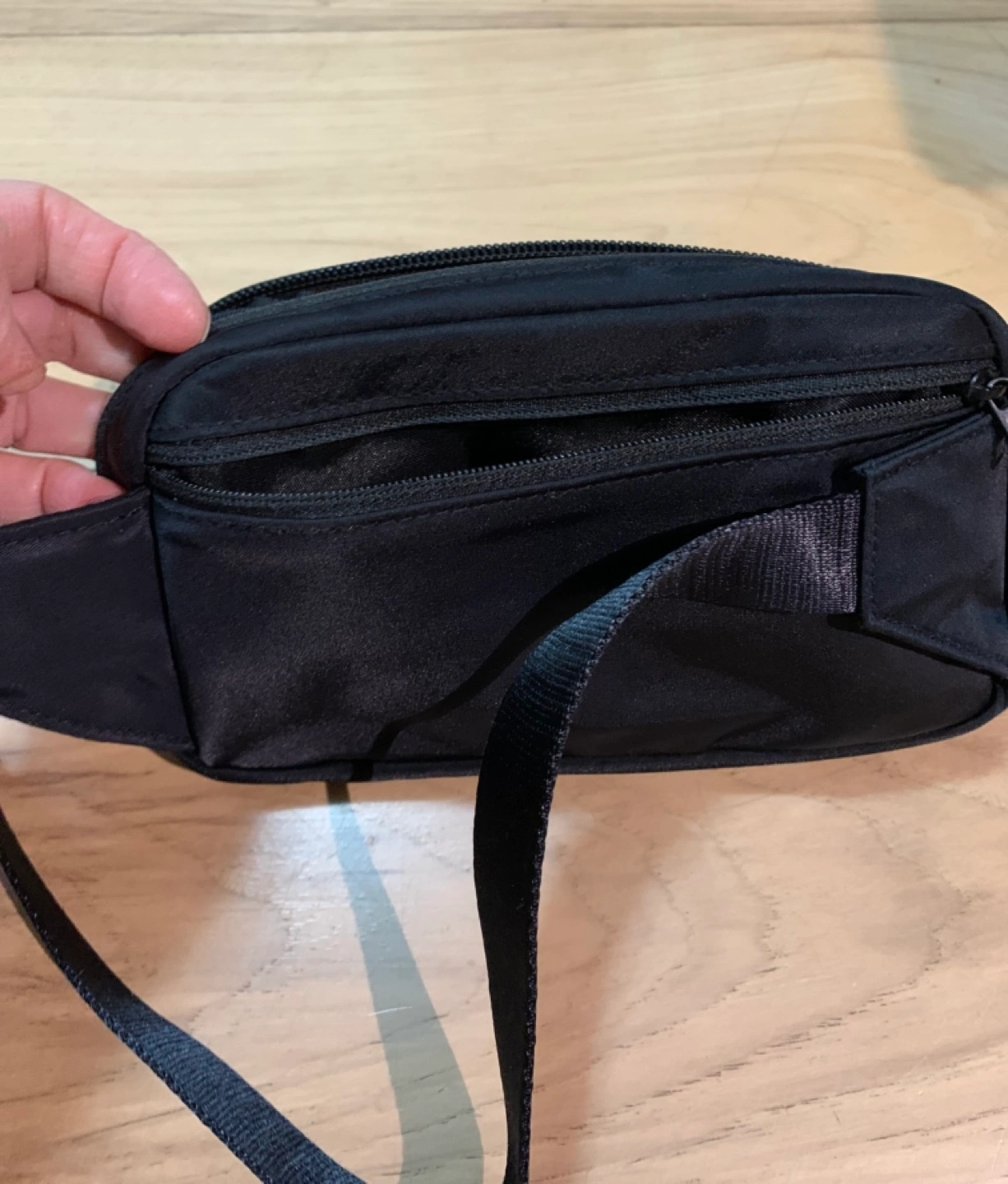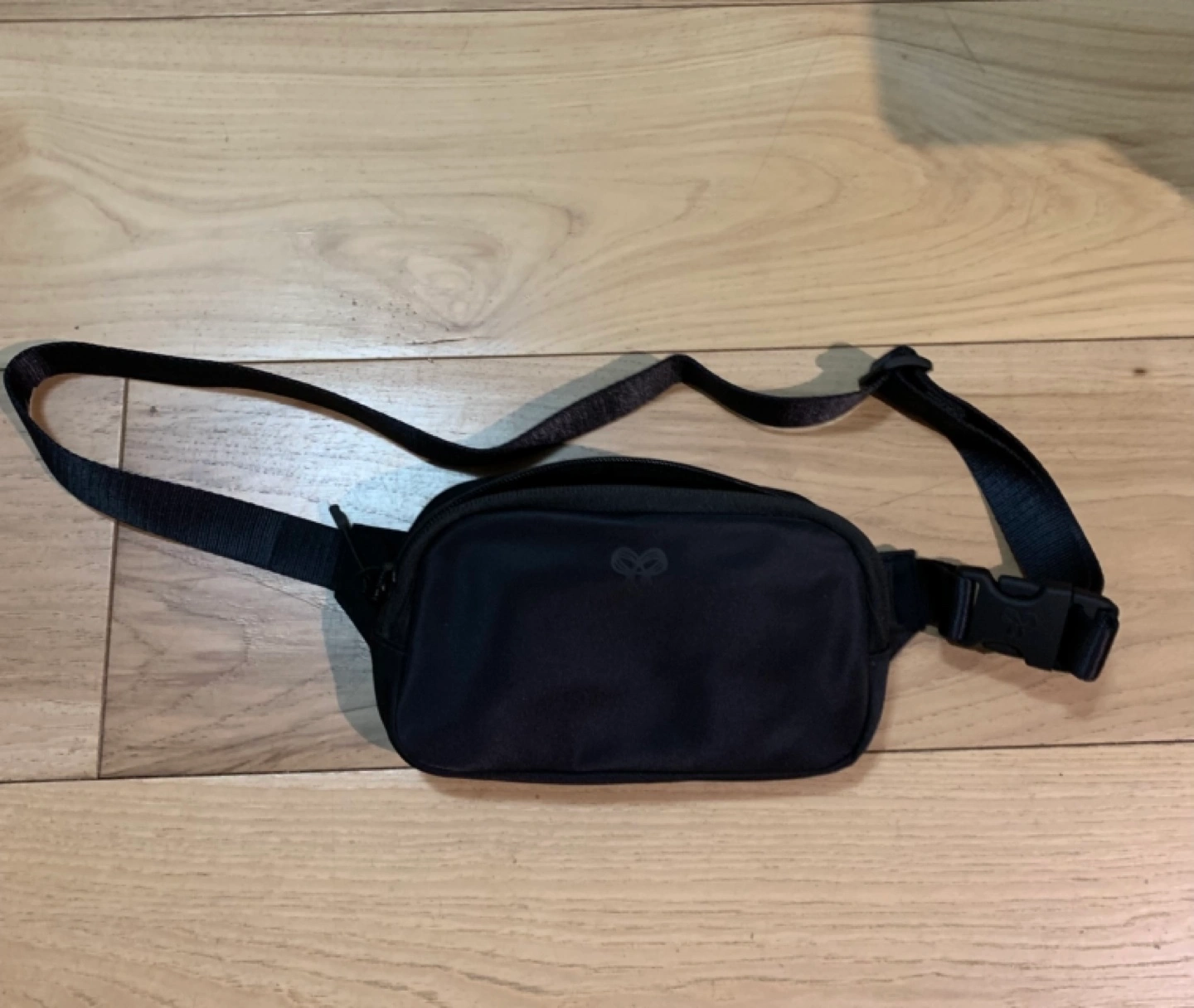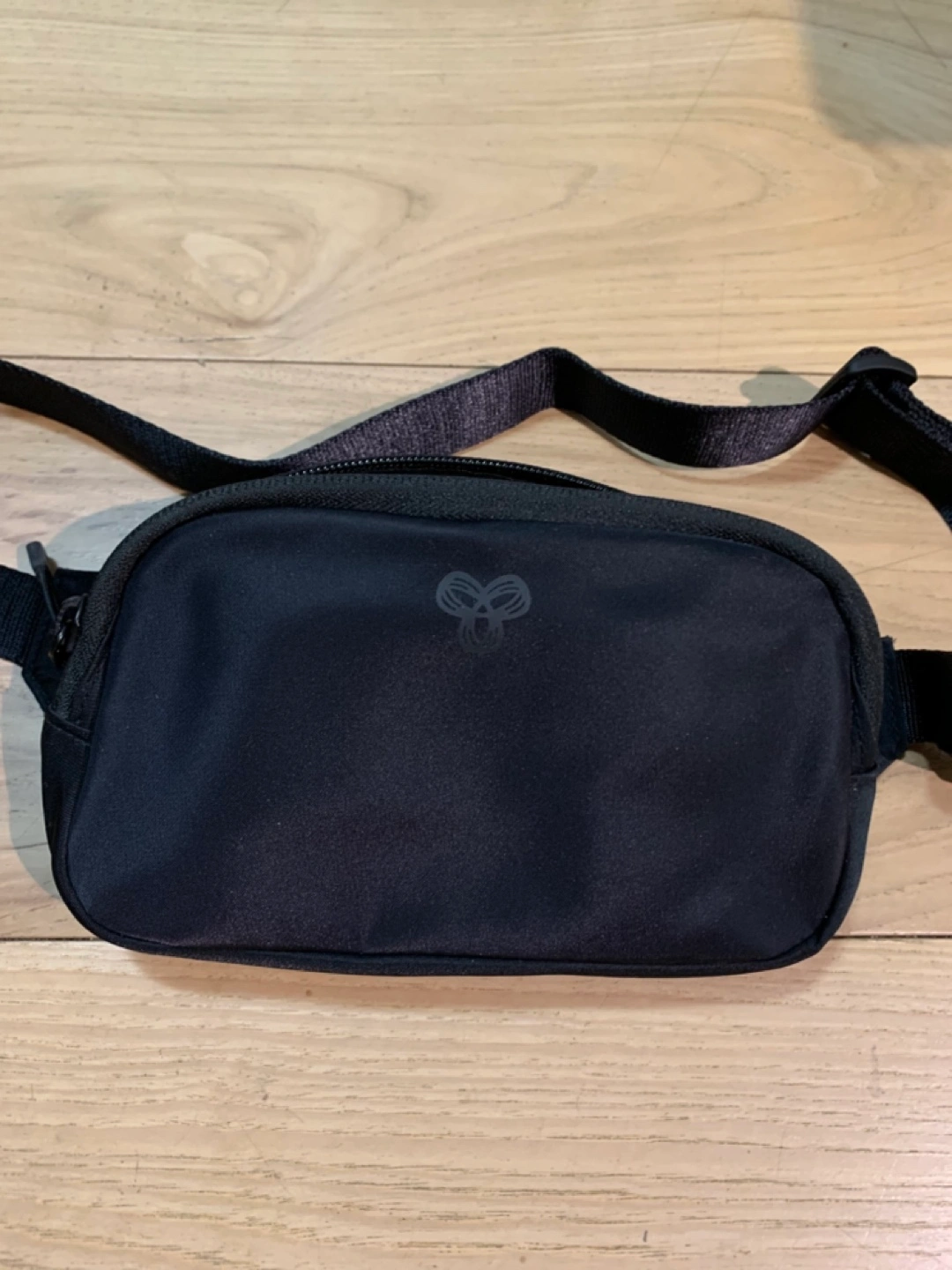 Small black waist bag. Adjustable strap. Zipper closure. Interior pockets. Great for everyday use.